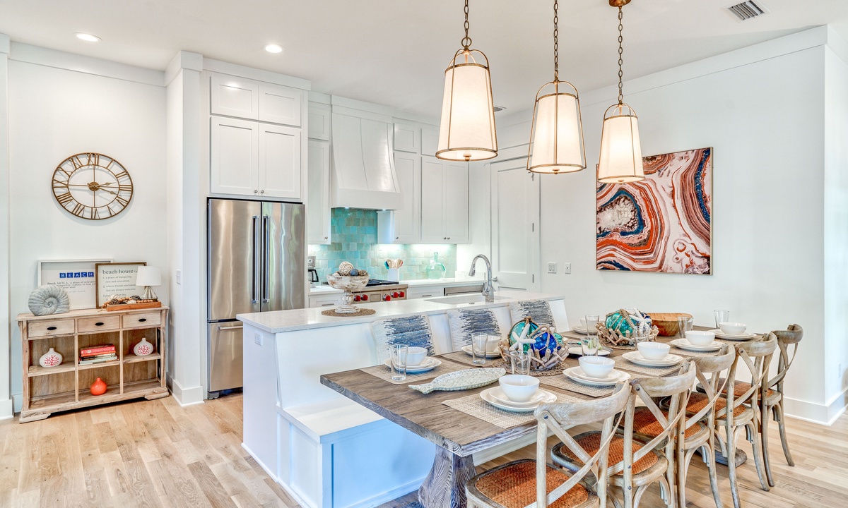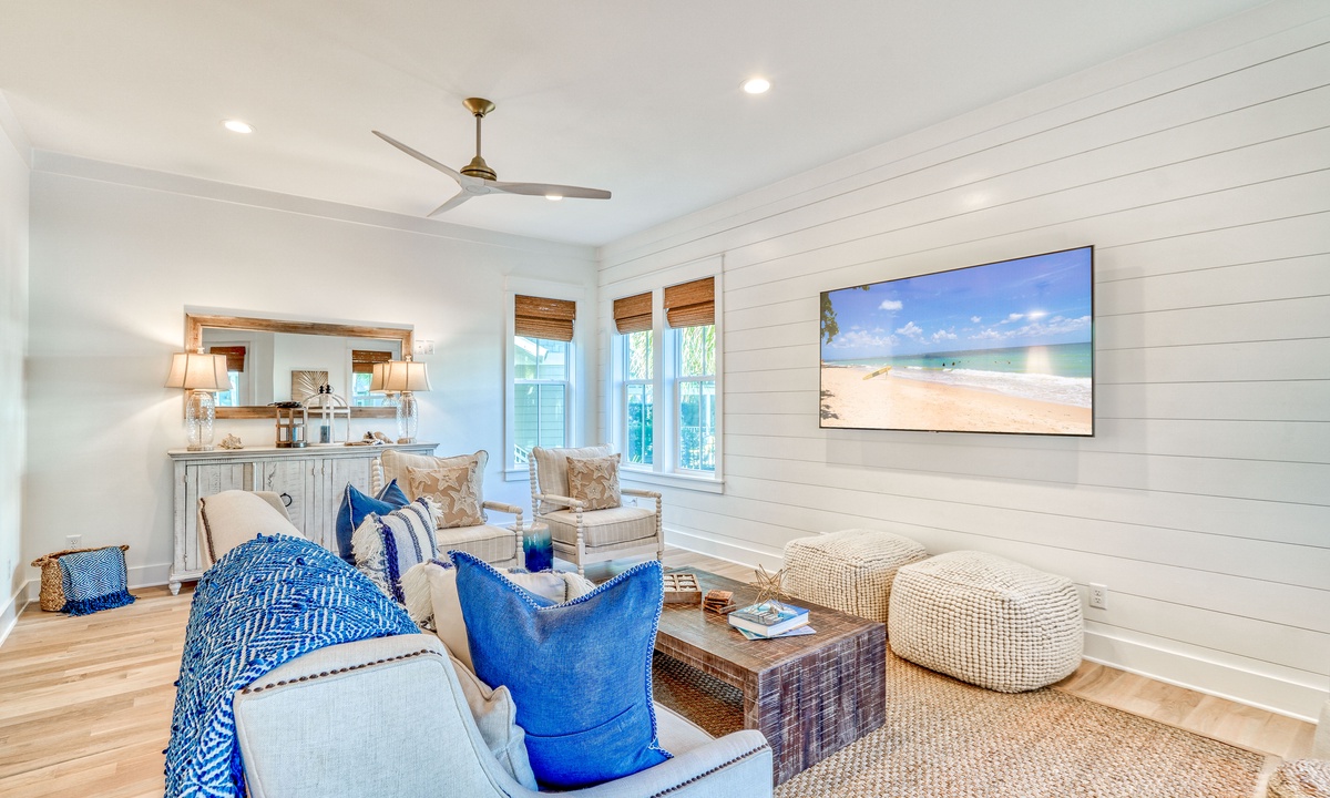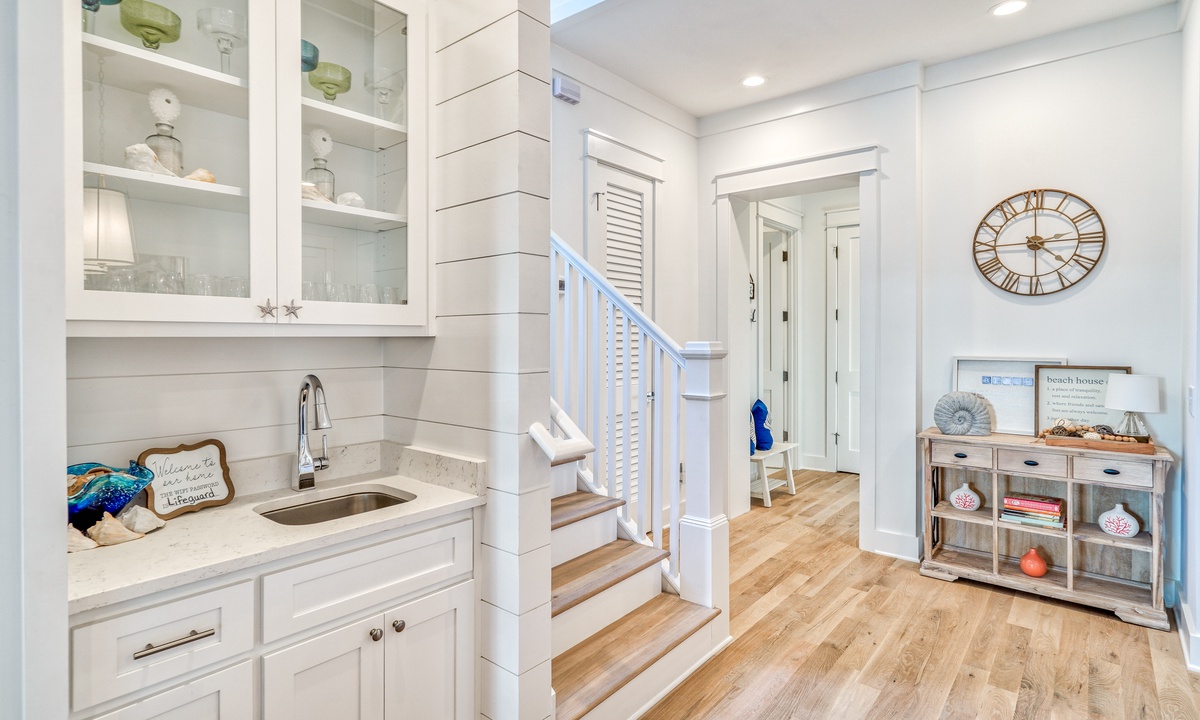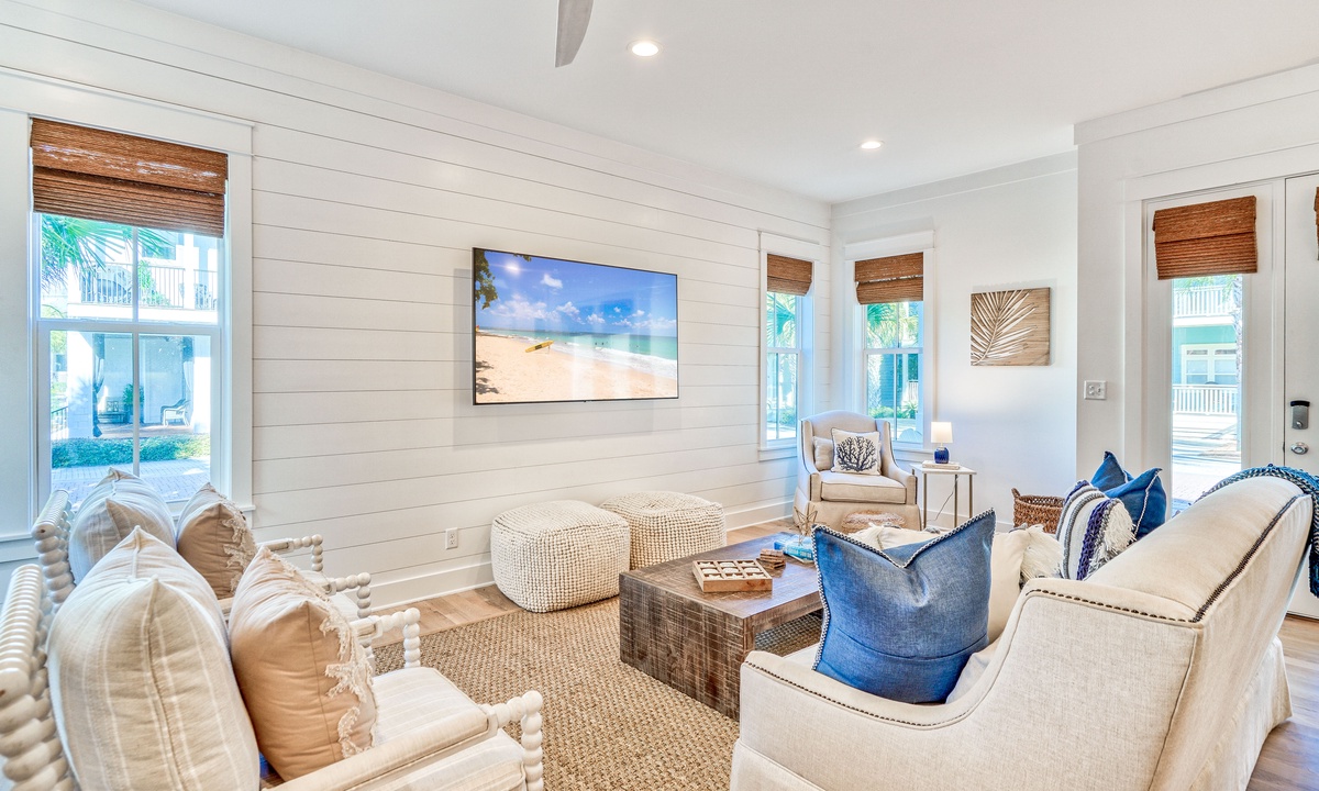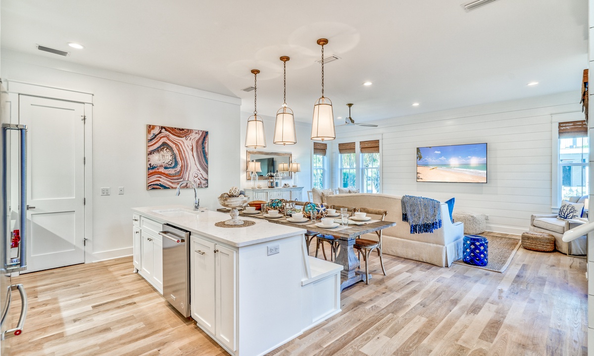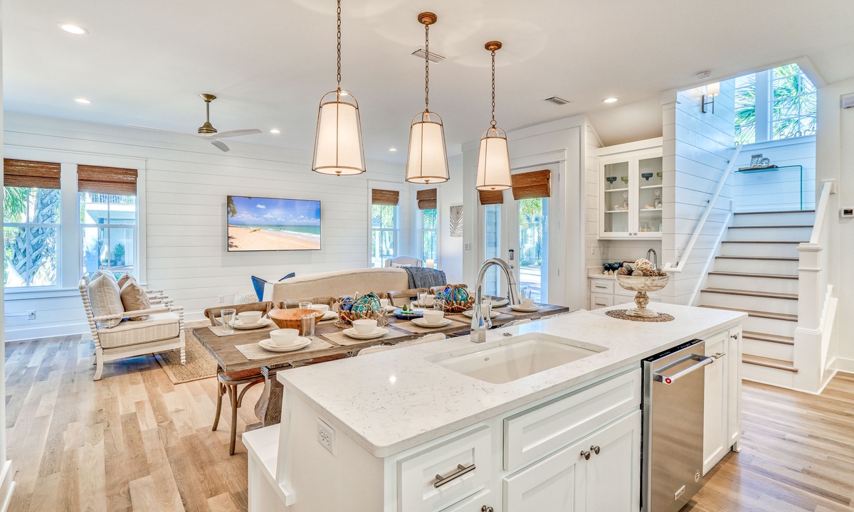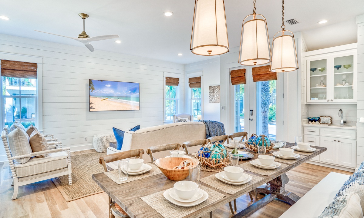 ⭐"Perfect house for large groups. The amenities and location were fantastic!" – Sarah F.Step into the bright and open main living area, designed for gathering and relaxation. Plush seating and a large smart TV make it the perfect place to unwind after a day of beach adventures. The seamless flow between the living, dining, and kitchen spaces creates a welcoming atmosphere for your group. A convenient wet bar on the 1st floor adds an extra touch of luxury and practicality for entertaining.
