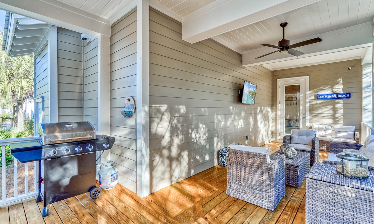 Experience the best of outdoor living with a state-of-the-art gas grilling station and a generously sized covered porch on the 1st floor. Unwind in cozy seating, indulge in a family barbecue, and catch your favorite shows on the flat-screen TV, all while enjoying the perfect blend of comfort and leisure.