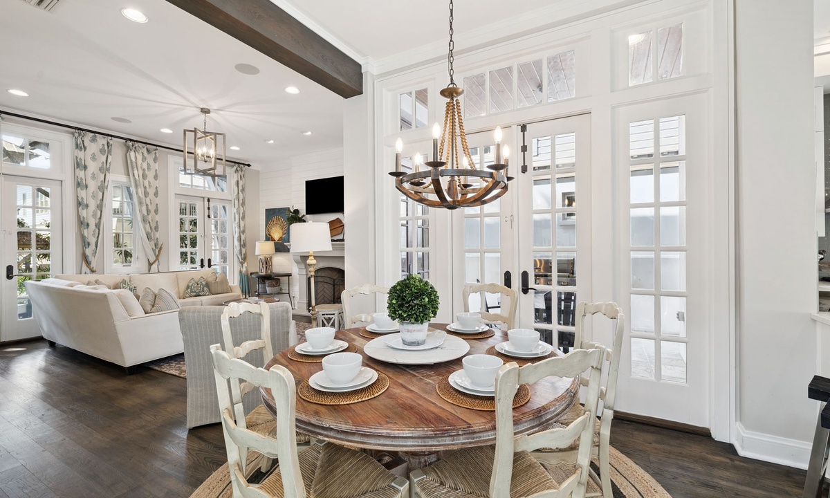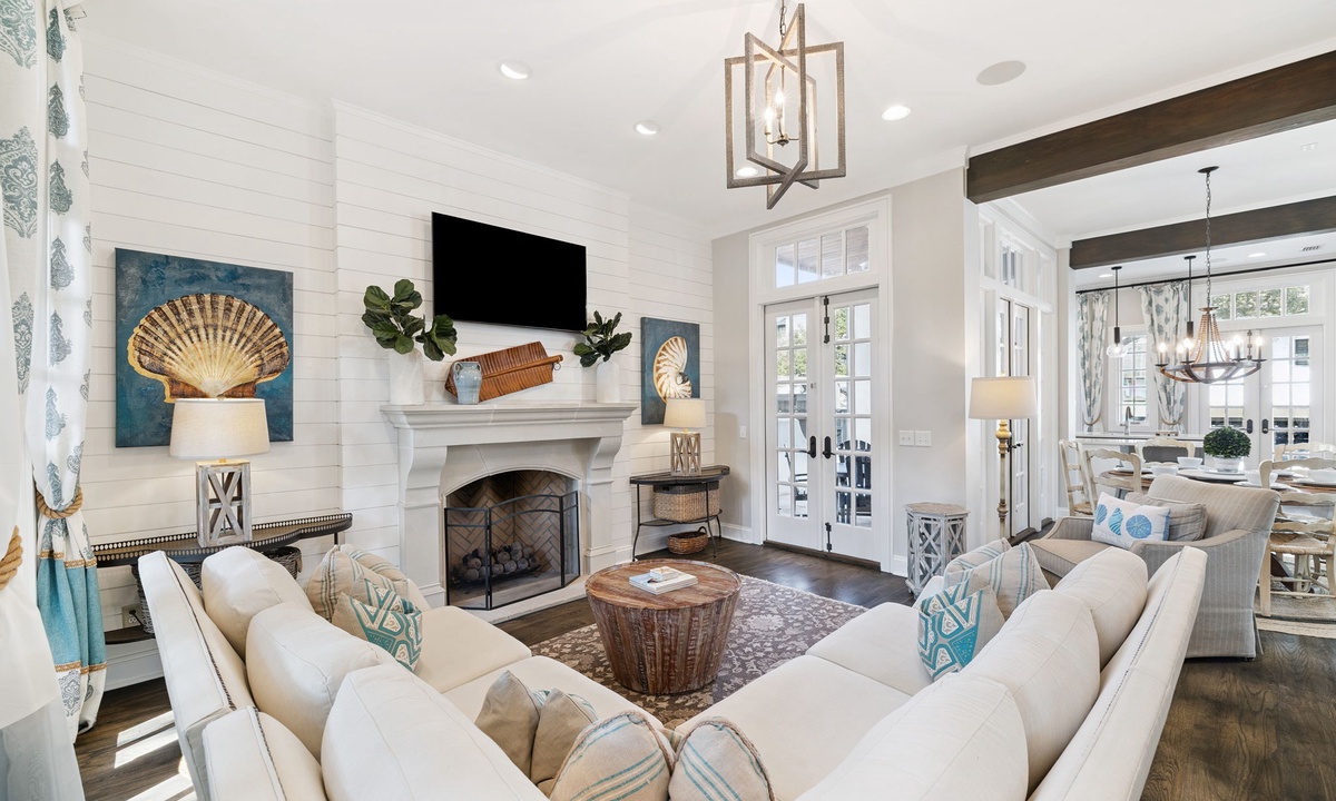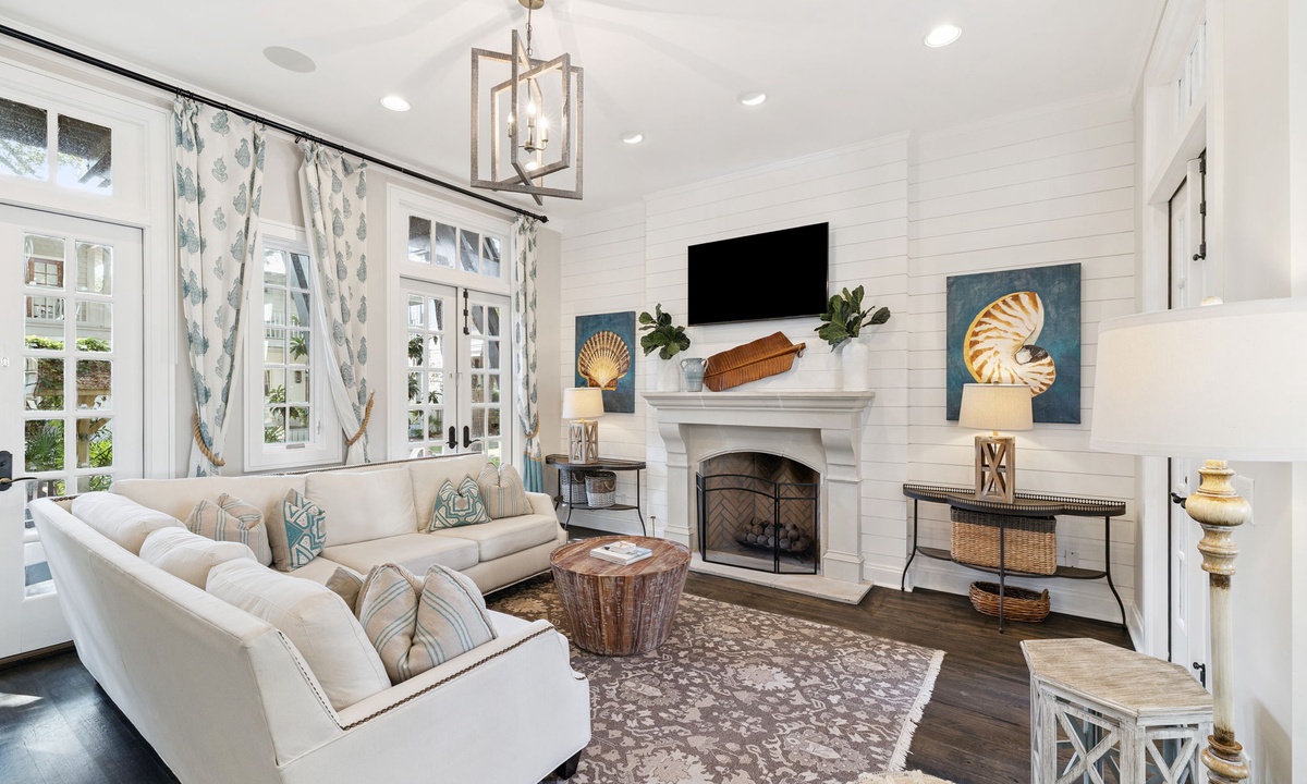 ⭐ "The home is gorgeous with everything you need. Beds were so comfy, and the location is perfect–we’ll be back!" – Kerry S.Step into an inviting open floor plan where elegant decor combines with practical design. The living room features cozy seating, a fireplace with a mounted TV, and direct access to two outdoor spaces – a serene front porch with park views and a courtyard dining area perfect for al fresco meals.