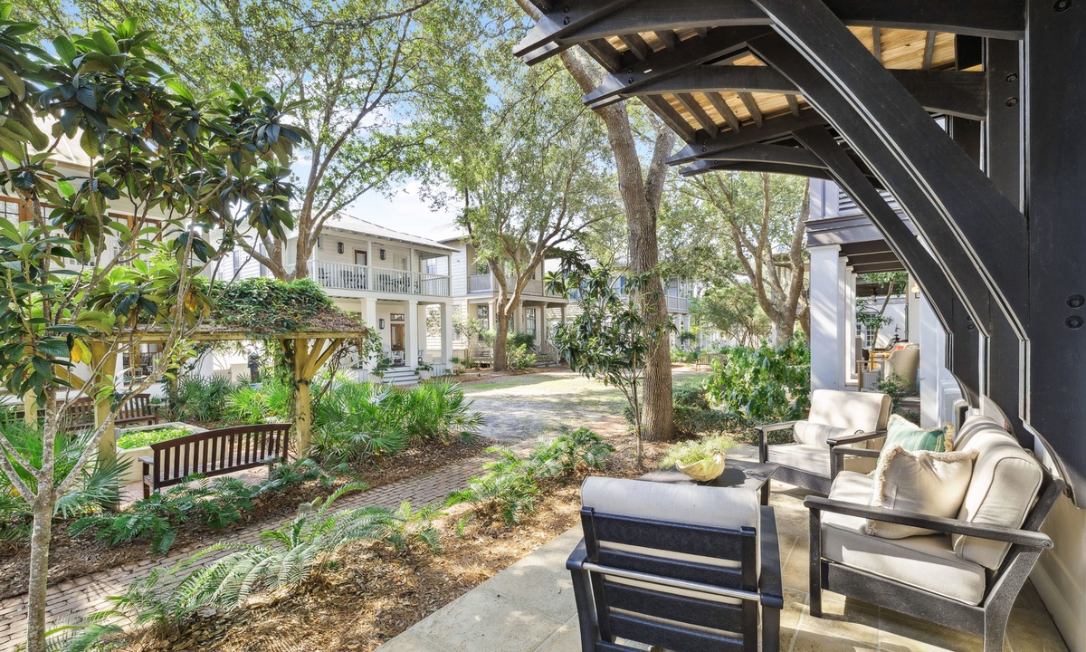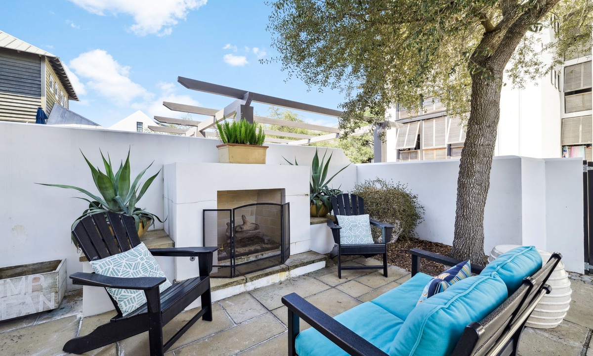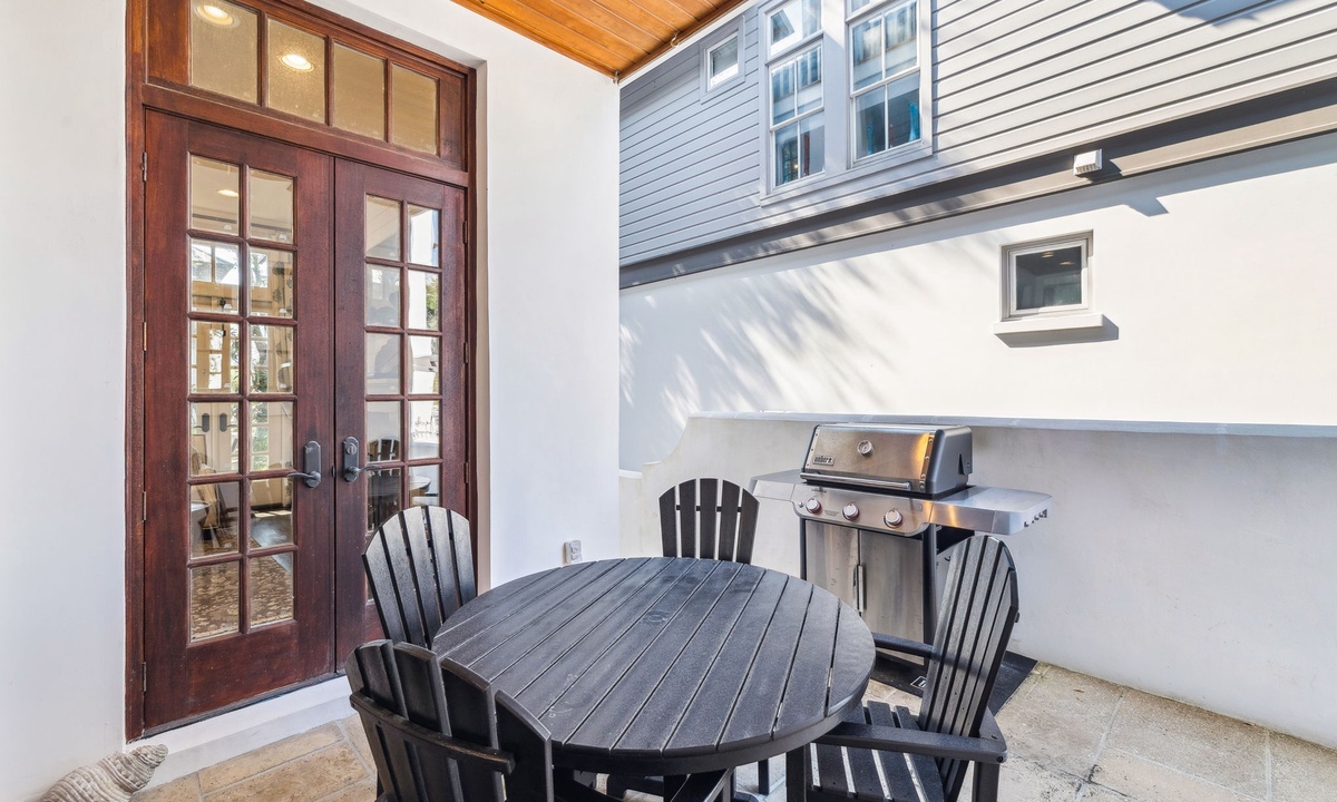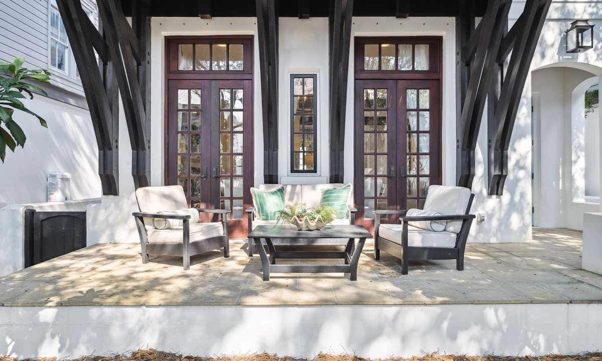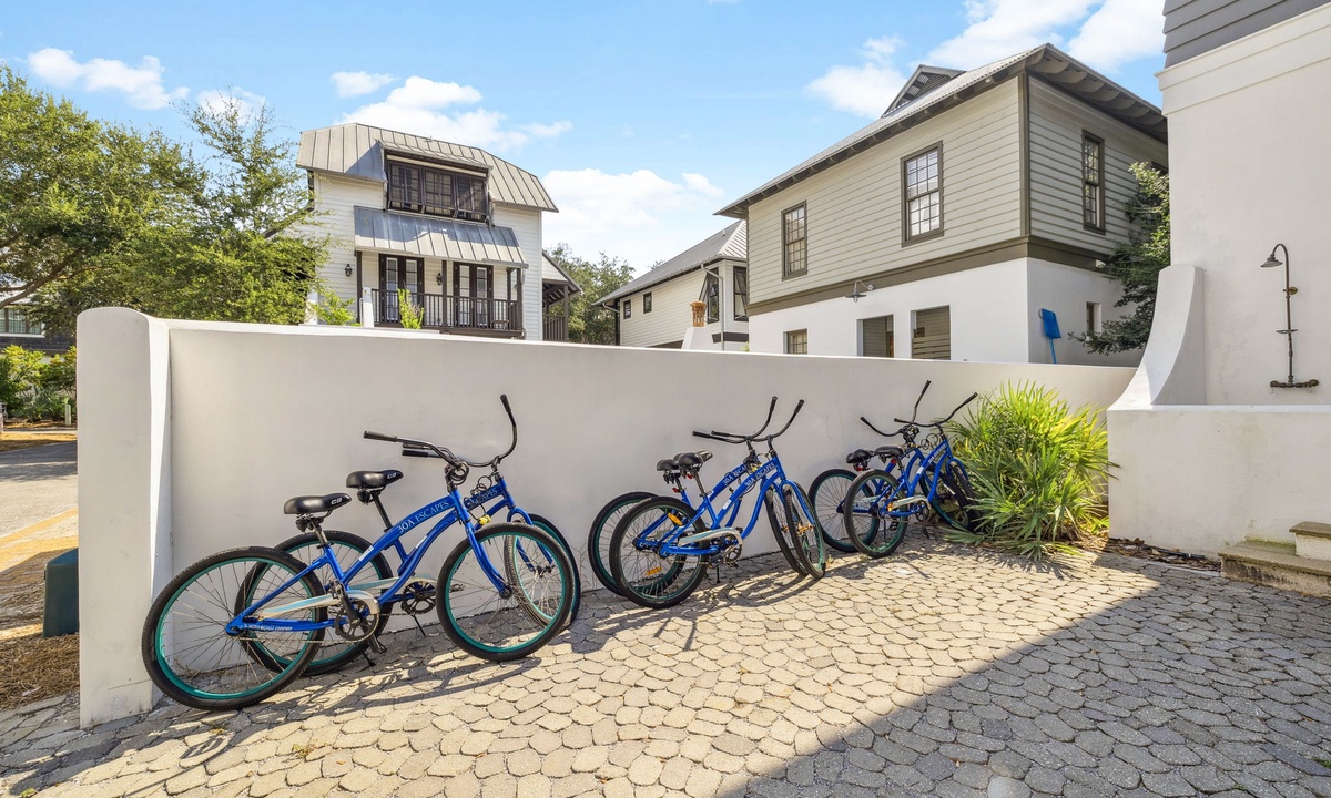 Find tranquility and fun right outside. Step out from the living room to the front porch facing West Kingston Park and enjoy your morning coffee on the cozy couch. From the other living room door, access a dining table for four and a grill, perfect for outdoor meals. The private courtyard also provides extra seating for evening drinks or quiet moments. And for leisurely rides through Rosemary Beach and beyond, take advantage of the 6 included beach cruisers.