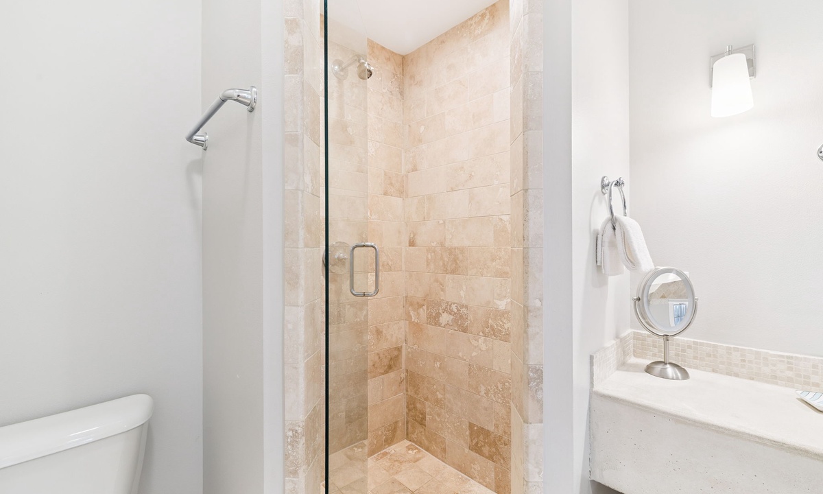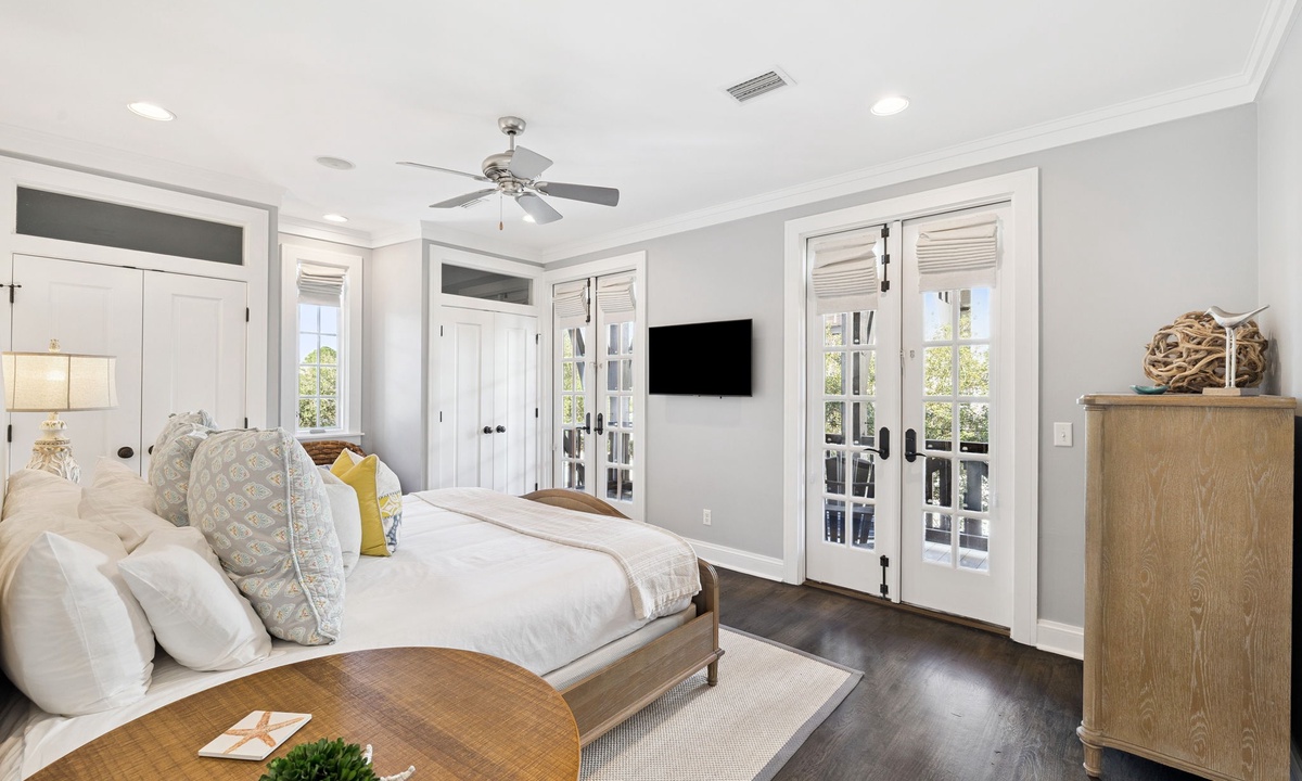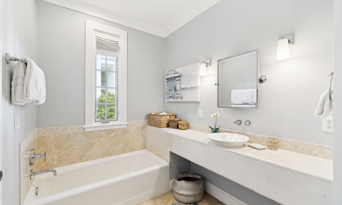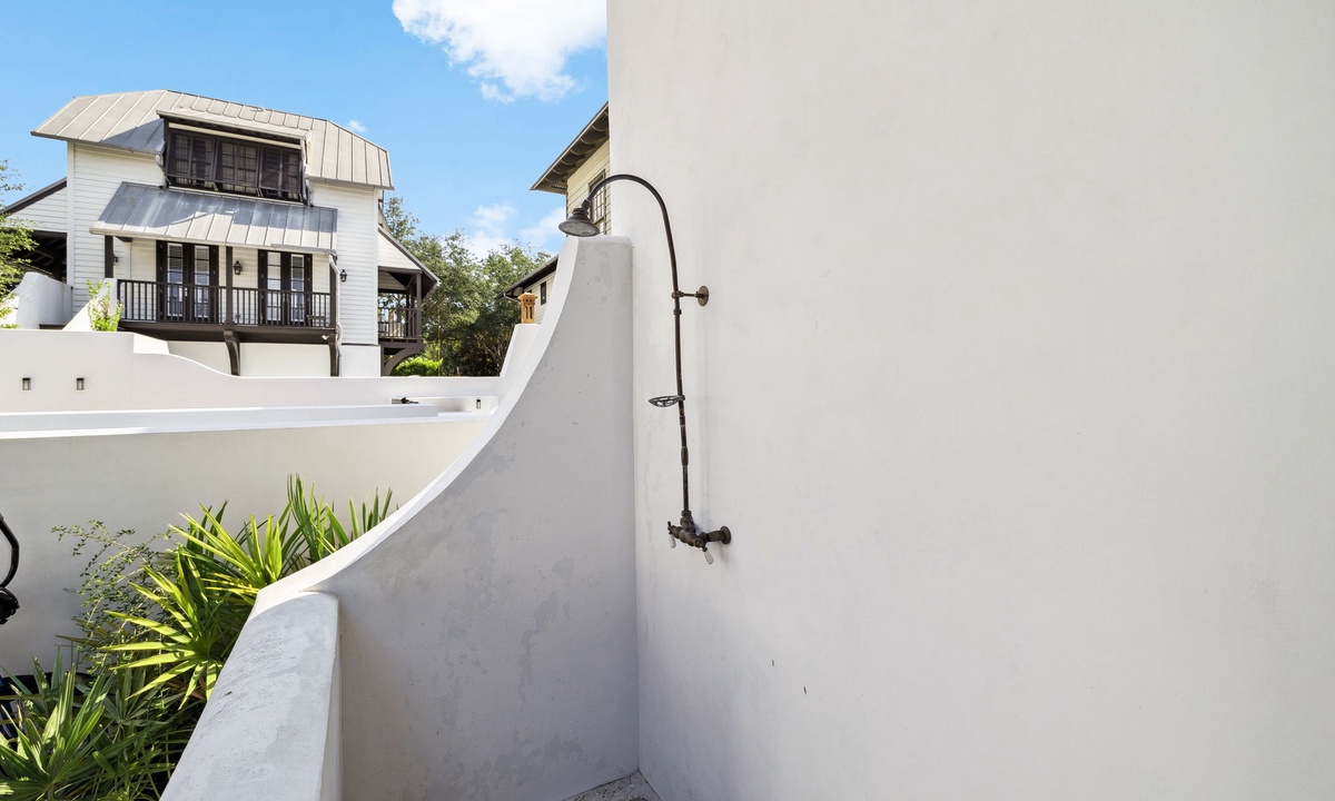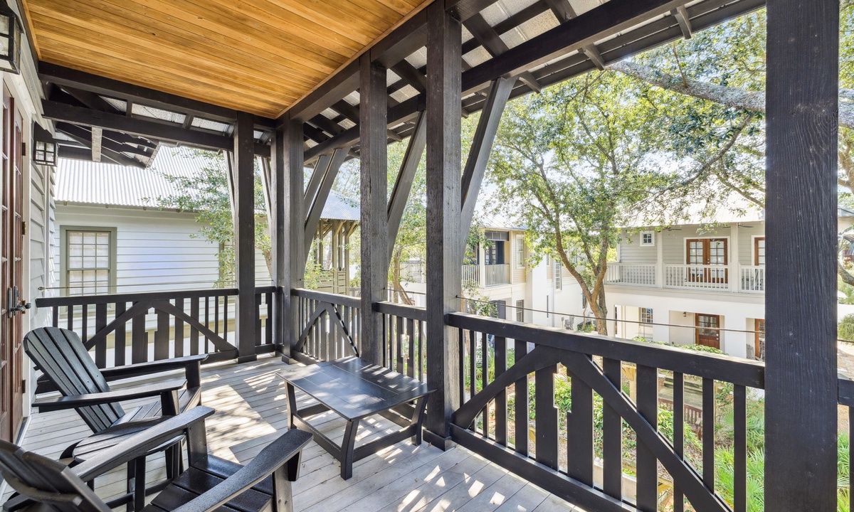Find tranquility and fun right outside. Step out from the living room to the front porch facing West Kingston Park and enjoy your morning coffee on the cozy couch. From the other living room door, access a dining table for four and a grill, perfect for outdoor meals. The private courtyard also provides extra seating for evening drinks or quiet moments. And for leisurely rides through Rosemary Beach and beyond, take advantage of the 6 included beach cruisers.