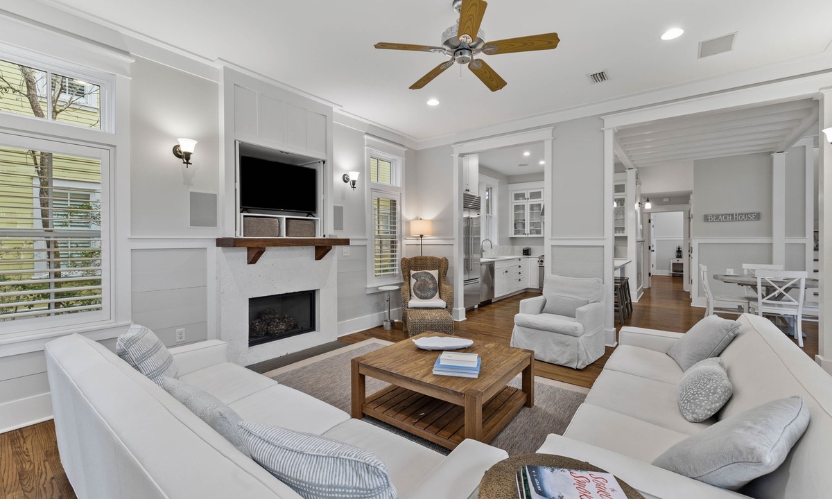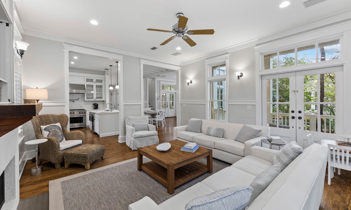 ⭐ "The property was exactly as described—clean, spacious, and just a short walk to the beach. Perfect for large groups!" – MichaelImmerse yourself in Florida charm and unmatched comfort within the expansive living spaces of this breathtaking home. The open-concept living room boasts a decorative fireplace and a sleek Smart TV, creating the ultimate retreat to unwind after a sun-soaked day at the beach. Elegant French doors open to beautifully furnished, covered porches, offering the perfect setting to savor serene outdoor moments in style.
