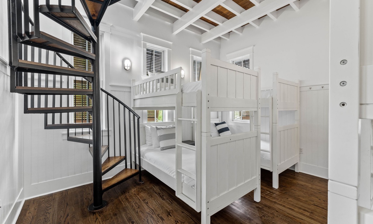Q: Hi! I'm interested in this house but I am confused about the floorplan. Excluding the bunkroom and the twin bed connected by stairs, how many rooms are there with single beds?- Maddie D. Posted: 04/18/2023A:The master suite on the first floor has a king bed