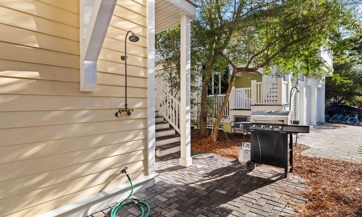 Relax and recharge in the stunning outdoor spaces of this home. Lounge on the beautifully furnished porches and balconies, or savor moments in the breezeway—a perfect spot for evening barbecues or tranquil mornings with a cup of coffee. Enjoy the convenience of a propane grill for al fresco dining, an outdoor shower to refresh after a day in the sun, and a private parking area to make your stay seamless. Every detail is designed for your comfort and leisure.