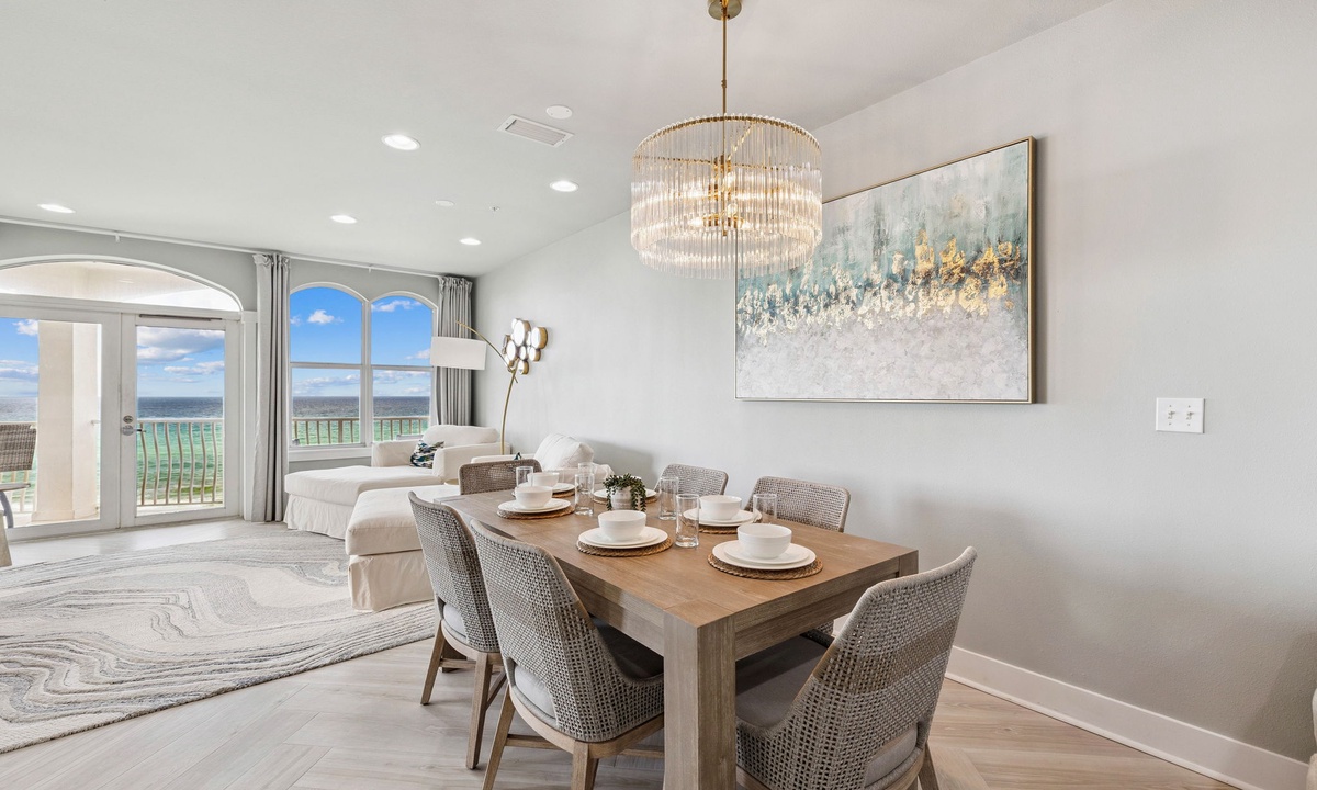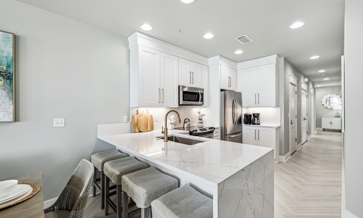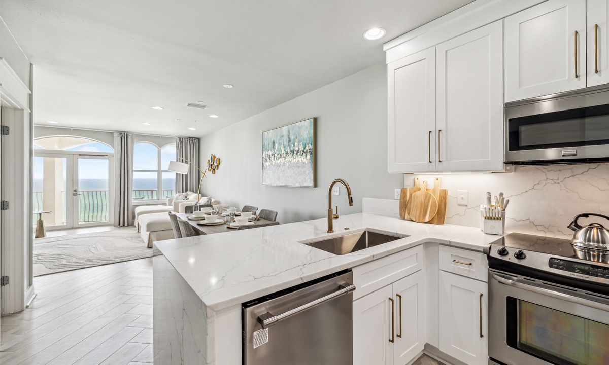 The sleek, fully-equipped kitchen has everything you need for a gourmet meal or seaside snack. Gather around the dining table or enjoy casual meals at the breakfast bar, all with Gulf views as your backdrop.
