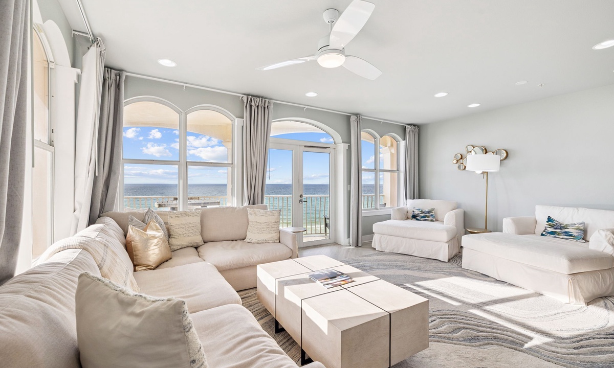 *** LIVING AREA ***Step into a light-filled living space with stunning Gulf views. The open layout features plush seating and bright coastal accents, creating the perfect spot to unwind or entertain. Glass doors open to an oversized balcony where you can relax to the sound of waves.