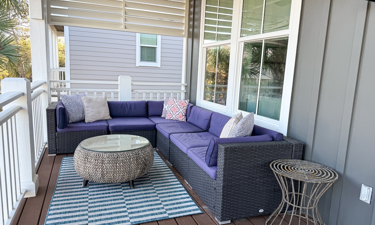 - Front-facing 2nd-floor balcony with outdoor sectional and lounge seating for 2