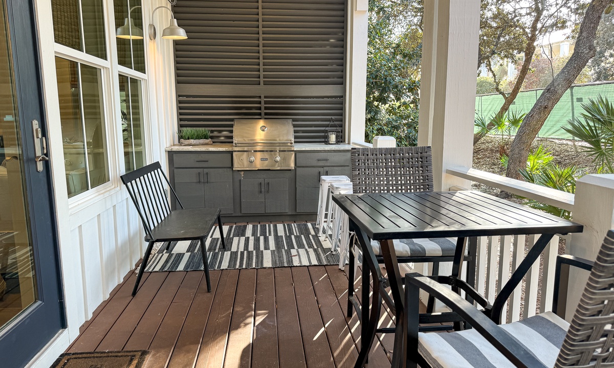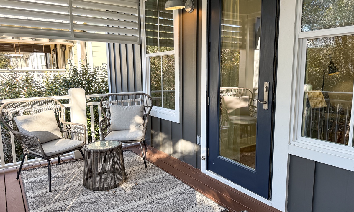 - Private balcony off the Primary Suite with lounge seating for 2 and a porch swing