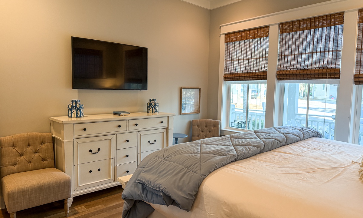 - Primary King Suite: King bed, flat-screen TV, private balcony access and En-suite with dual vanities and oversized walk-in shower