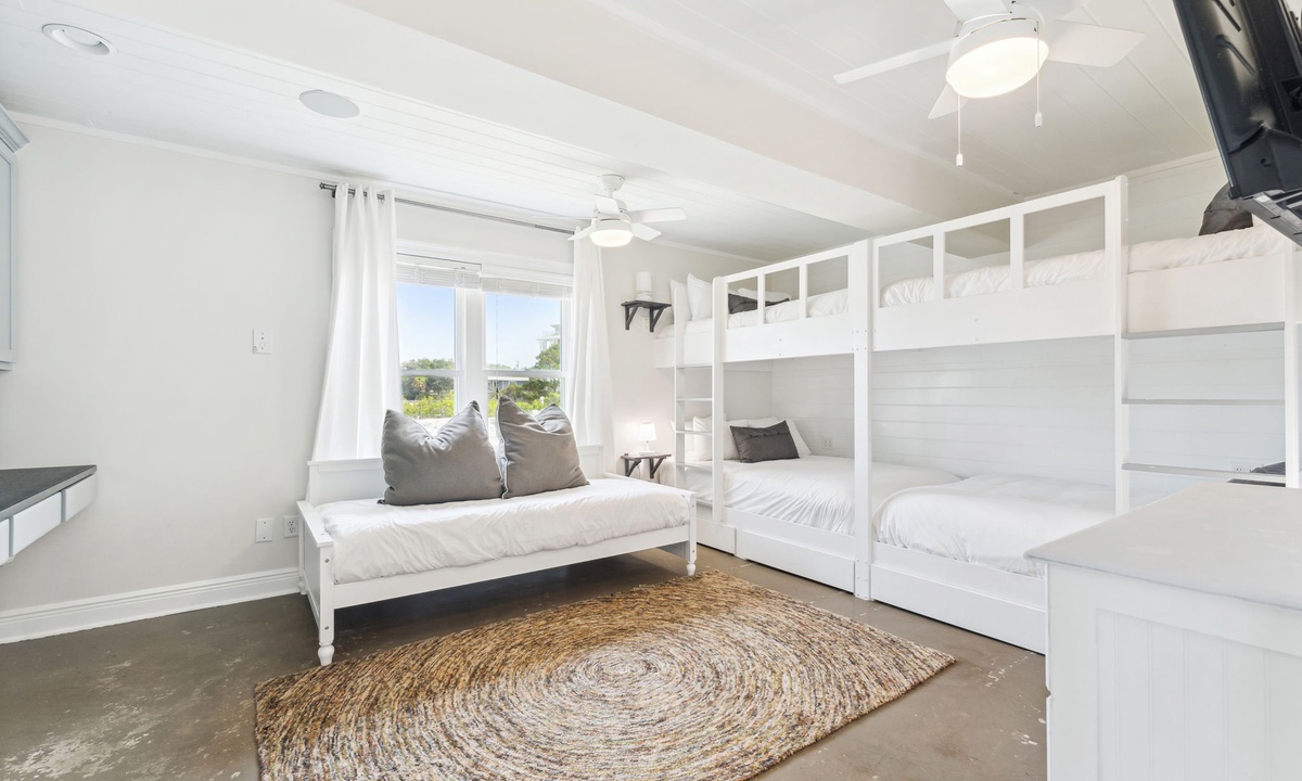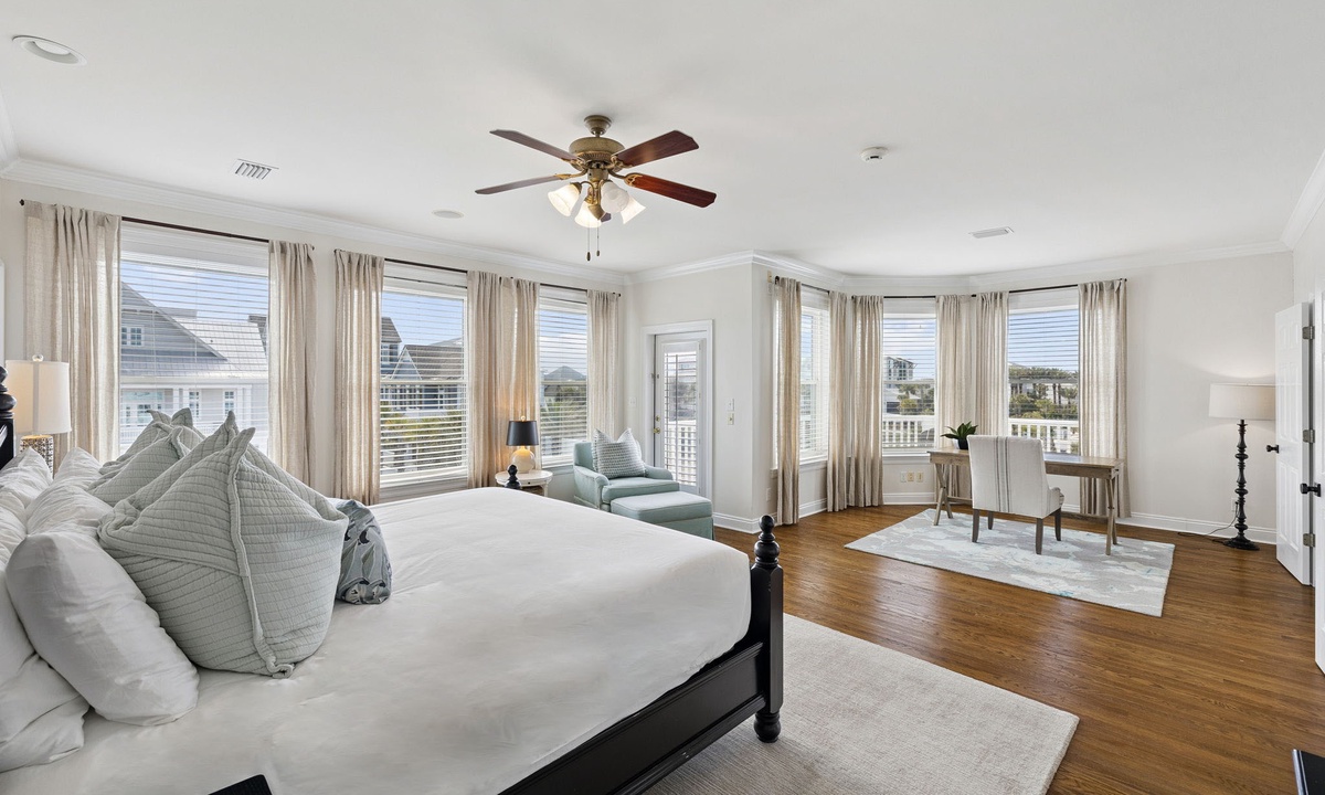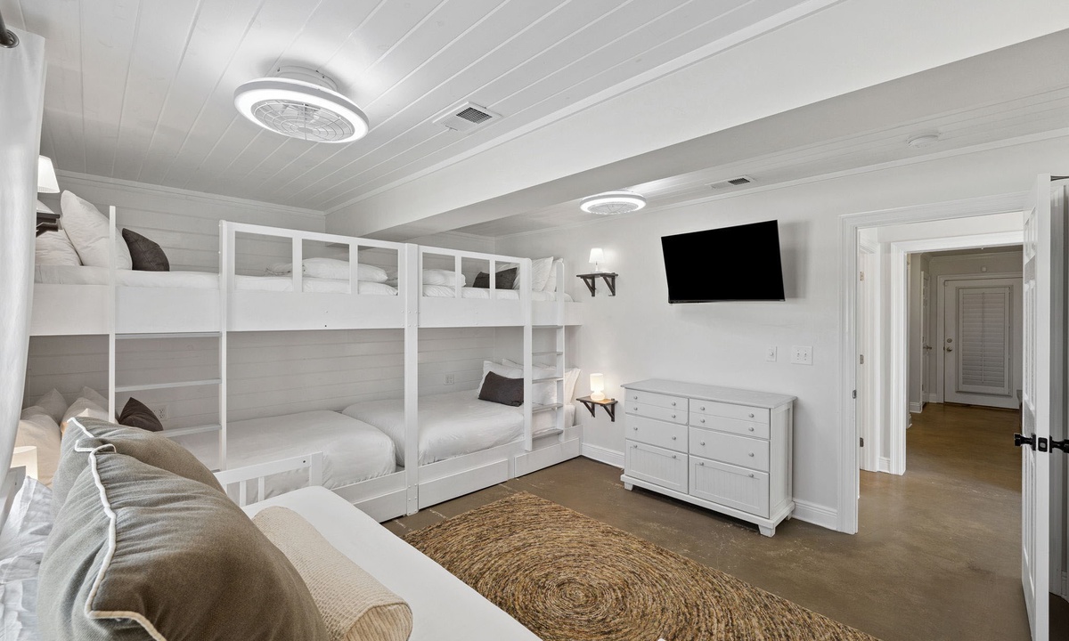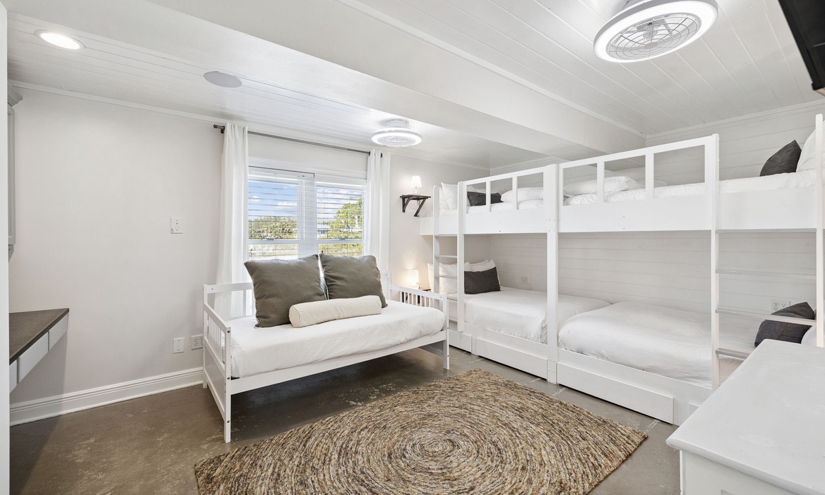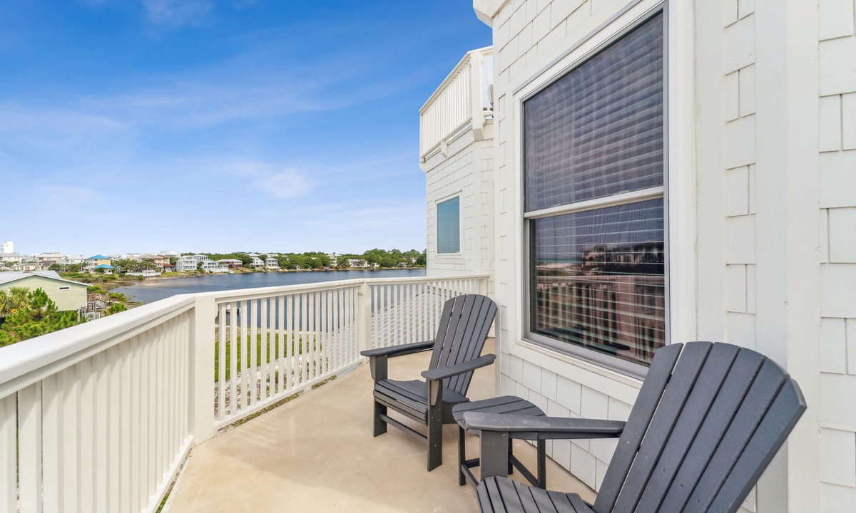 Q: What is the bedroom descriptions for this property? How many and what type of beds in each bedroom- Lindsay T. Posted: 10/24/2023A:The gorgeous primary suite is located on the third floor and features a king bed, desk, walk in closet and private balcony with Gulf Views. The primary en suite has his and her vanities, walk in shower with Lake Views and a soaking tub. Two additional king guest bedrooms are also on the third floor and are connected by a shared bathroom. The shared guest bathroom has two sinks and a shower/tub combo. Both bedrooms have private balconies that face the Eastern Lake. Escape to the four floor of the home where you will find expansive balcony spaces that wrap around the entire house! There is a large sectional sofa and a high top table to enjoy the Gulf breeze and sunsets over the Emerald Coast! The bedroom on this level is at the top of the landing and has a twin over full bunk bed with a powder room. The ground level living spaces include two guest bedrooms, two bathrooms, a kitchenette and access to the pool and dock! There is a king guest suite with a private en suite that includes a sink and walk in shower. The kitchenette is in the king guest suite with a microwave, sink, and mini fridge. The second bedroom is a fun custom built bunk room with four queens and one twin daybed. The bathroom next to the bunk room has two sinks and a shower/tub combo