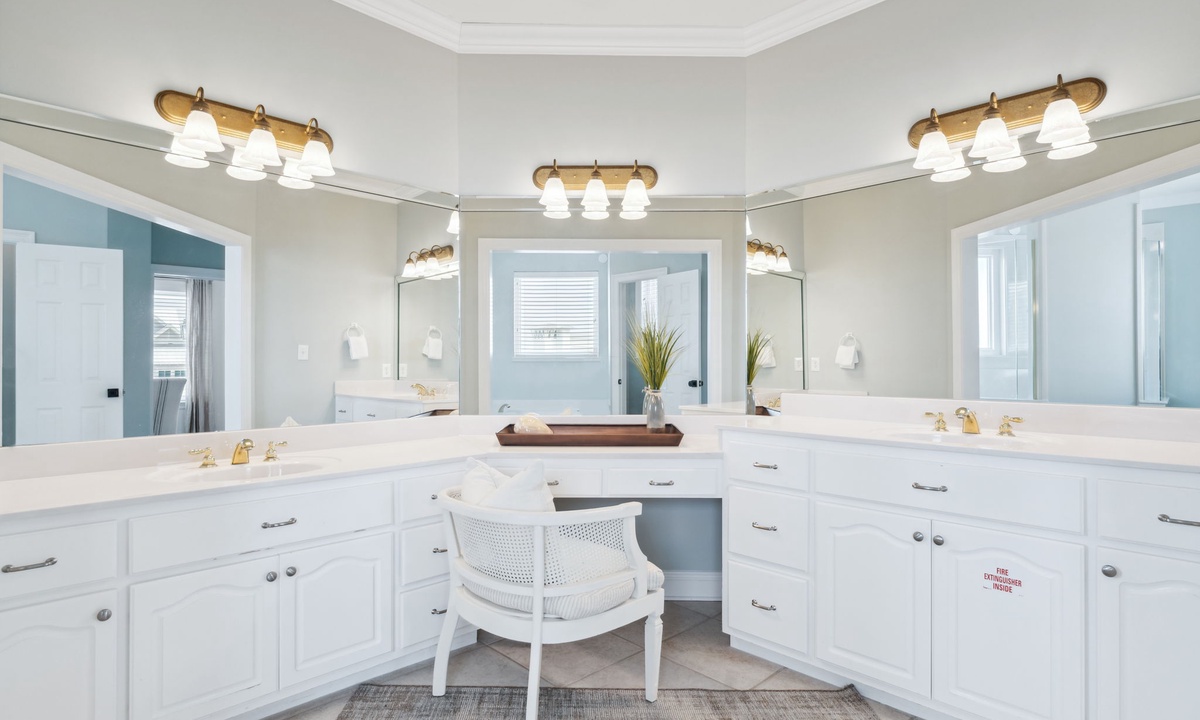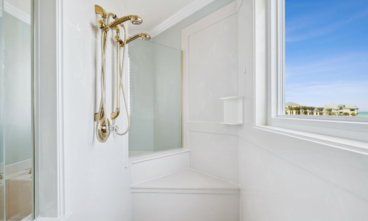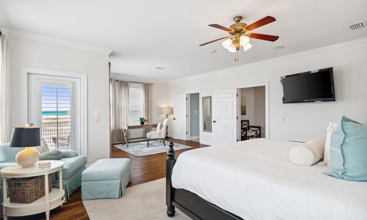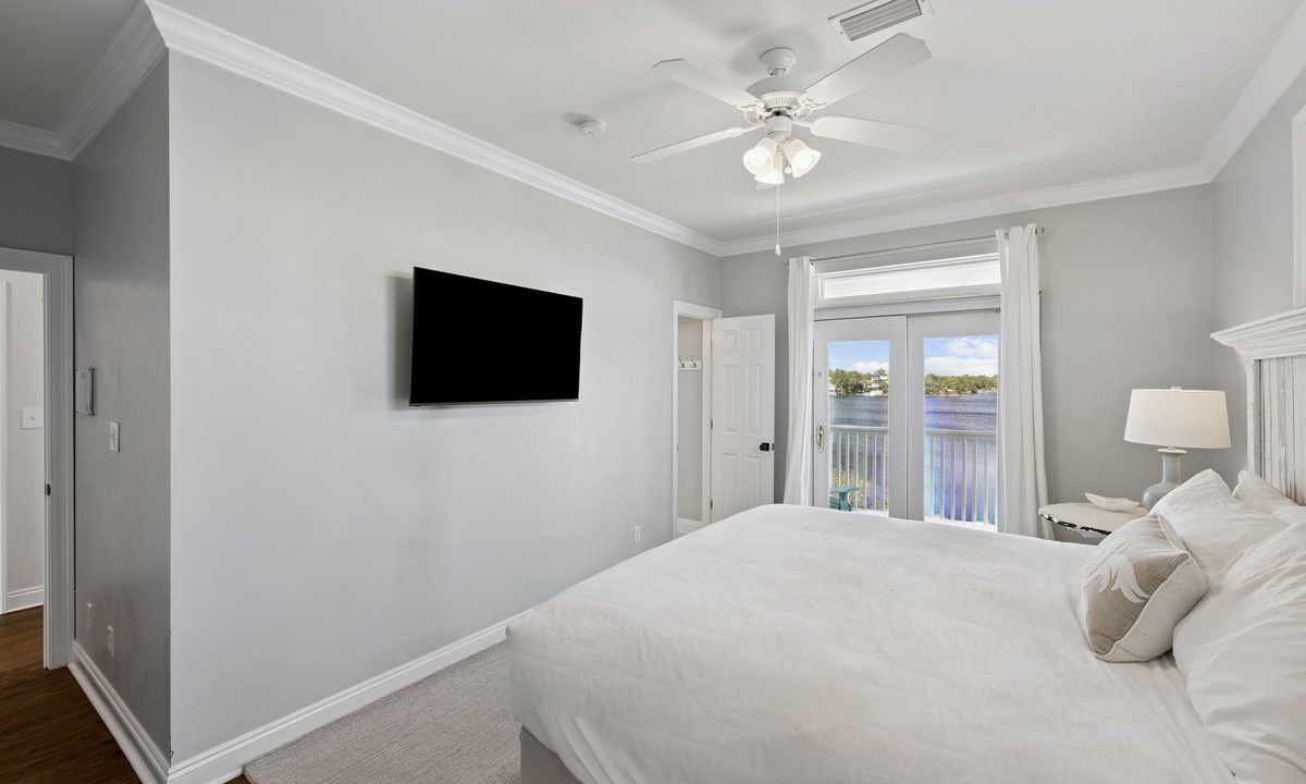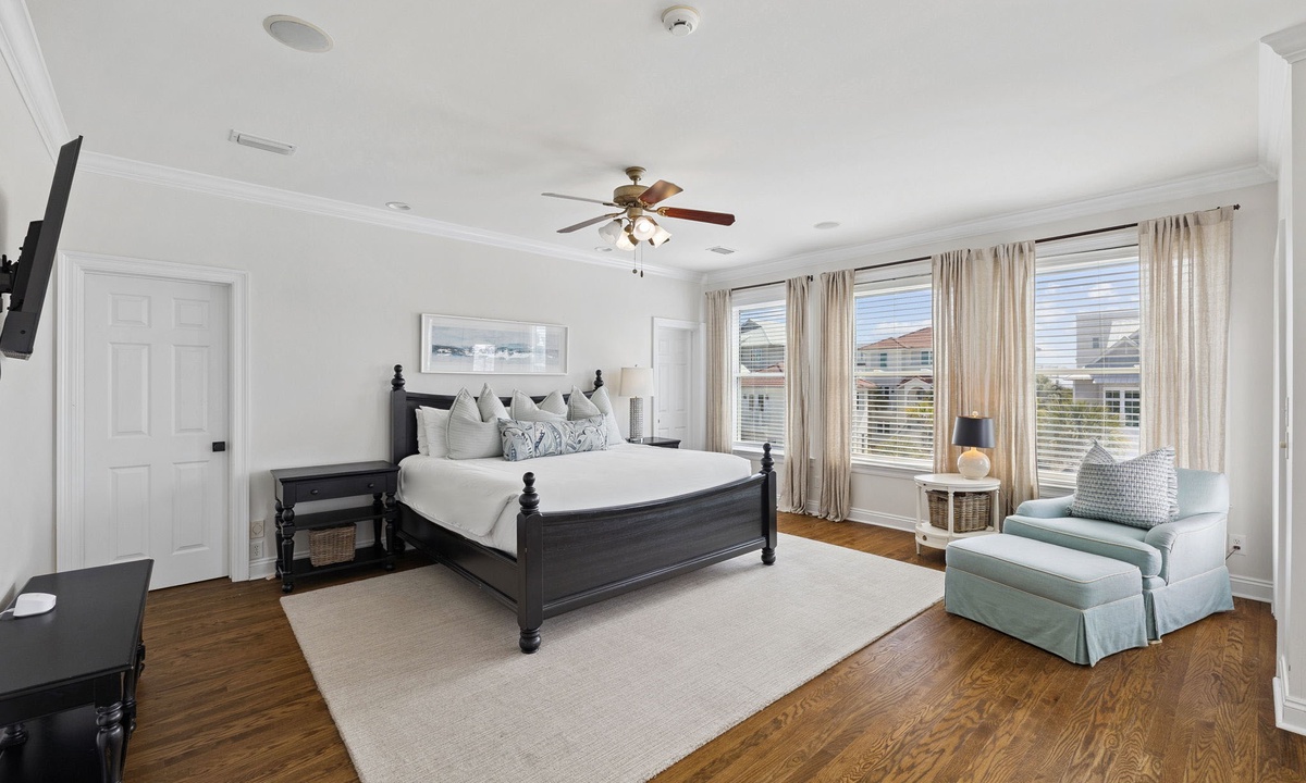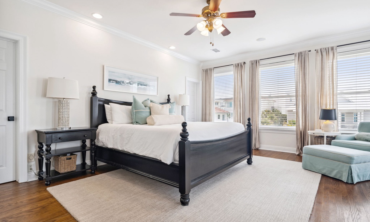 Q: What is the bedroom descriptions for this property? How many and what type of beds in each bedroom- Lindsay T. Posted: 10/24/2023A:The gorgeous primary suite is located on the third floor and features a king bed, desk, walk in closet and private balcony with Gulf Views. The primary en suite has his and her vanities, walk in shower with Lake Views and a soaking tub. Two additional king guest bedrooms are also on the third floor and are connected by a shared bathroom. The shared guest bathroom has two sinks and a shower/tub combo. Both bedrooms have private balconies that face the Eastern Lake. Escape to the four floor of the home where you will find expansive balcony spaces that wrap around the entire house! There is a large sectional sofa and a high top table to enjoy the Gulf breeze and sunsets over the Emerald Coast! The bedroom on this level is at the top of the landing and has a twin over full bunk bed with a powder room. The ground level living spaces include two guest bedrooms, two bathrooms, a kitchenette and access to the pool and dock! There is a king guest suite with a private en suite that includes a sink and walk in shower. The kitchenette is in the king guest suite with a microwave, sink, and mini fridge. The second bedroom is a fun custom built bunk room with four queens and one twin daybed. The bathroom next to the bunk room has two sinks and a shower/tub combo