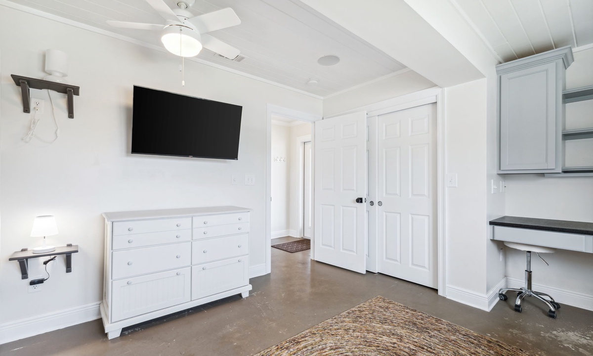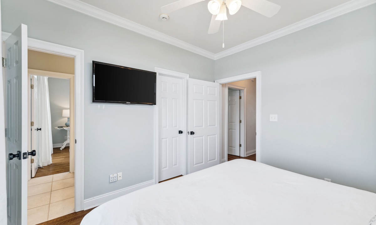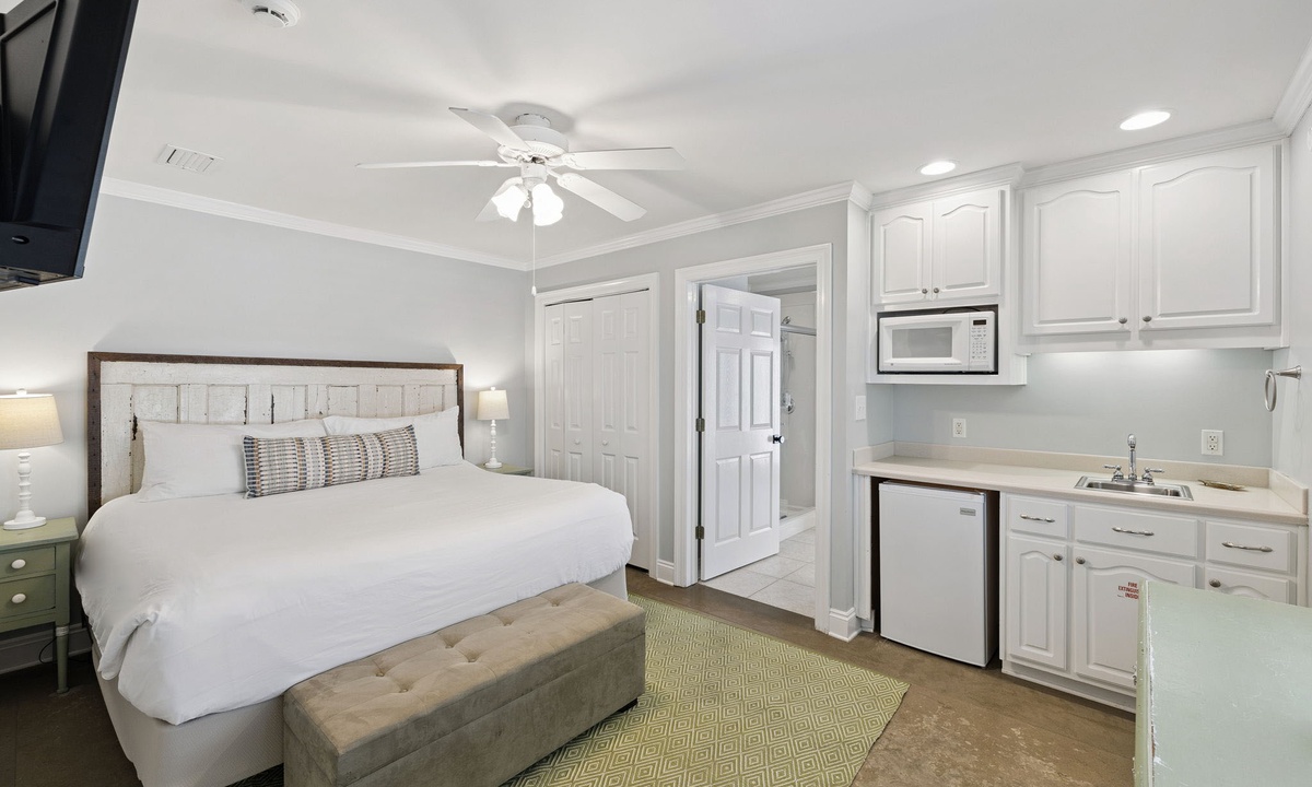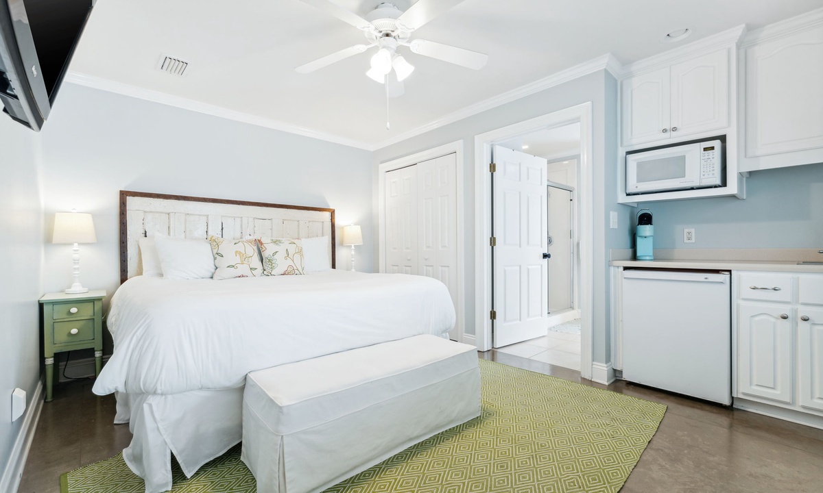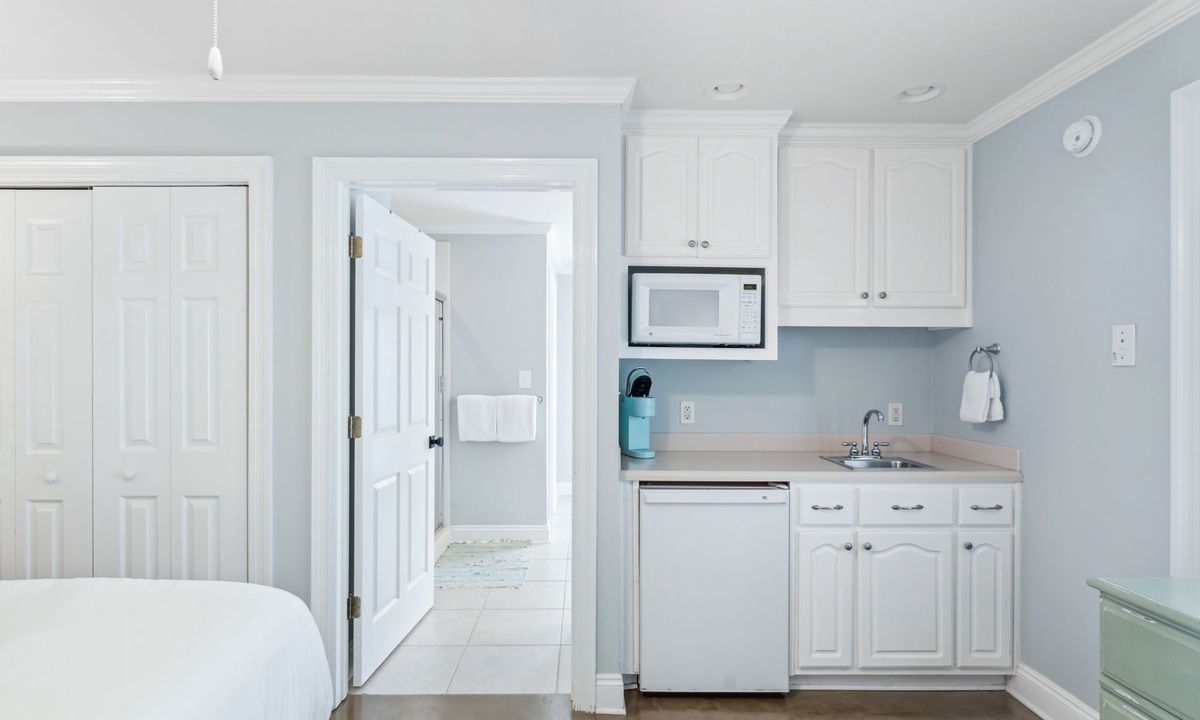 Q: What is the bedroom descriptions for this property? How many and what type of beds in each bedroom- Lindsay T. Posted: 10/24/2023A:The gorgeous primary suite is located on the third floor and features a king bed, desk, walk in closet and private balcony with Gulf Views. The primary en suite has his and her vanities, walk in shower with Lake Views and a soaking tub. Two additional king guest bedrooms are also on the third floor and are connected by a shared bathroom. The shared guest bathroom has two sinks and a shower/tub combo. Both bedrooms have private balconies that face the Eastern Lake. Escape to the four floor of the home where you will find expansive balcony spaces that wrap around the entire house! There is a large sectional sofa and a high top table to enjoy the Gulf breeze and sunsets over the Emerald Coast! The bedroom on this level is at the top of the landing and has a twin over full bunk bed with a powder room. The ground level living spaces include two guest bedrooms, two bathrooms, a kitchenette and access to the pool and dock! There is a king guest suite with a private en suite that includes a sink and walk in shower. The kitchenette is in the king guest suite with a microwave, sink, and mini fridge. The second bedroom is a fun custom built bunk room with four queens and one twin daybed. The bathroom next to the bunk room has two sinks and a shower/tub combo