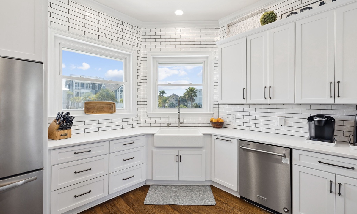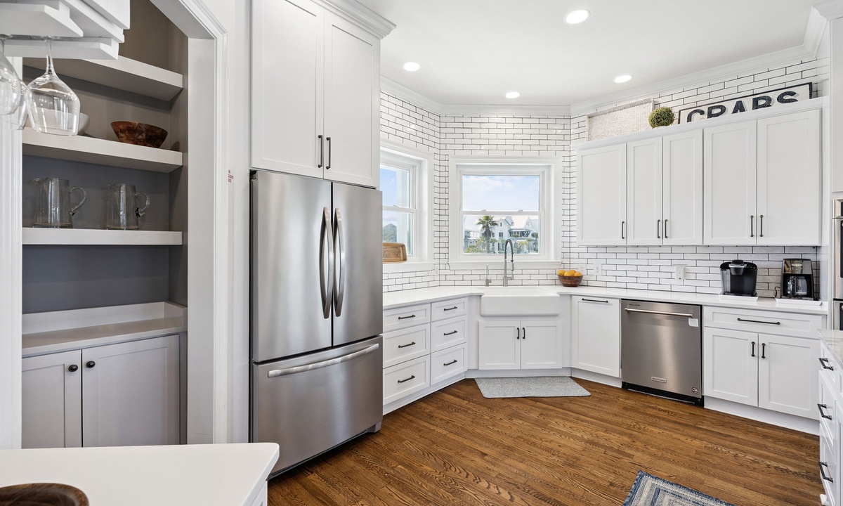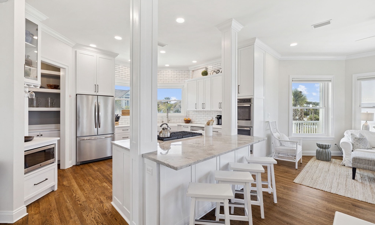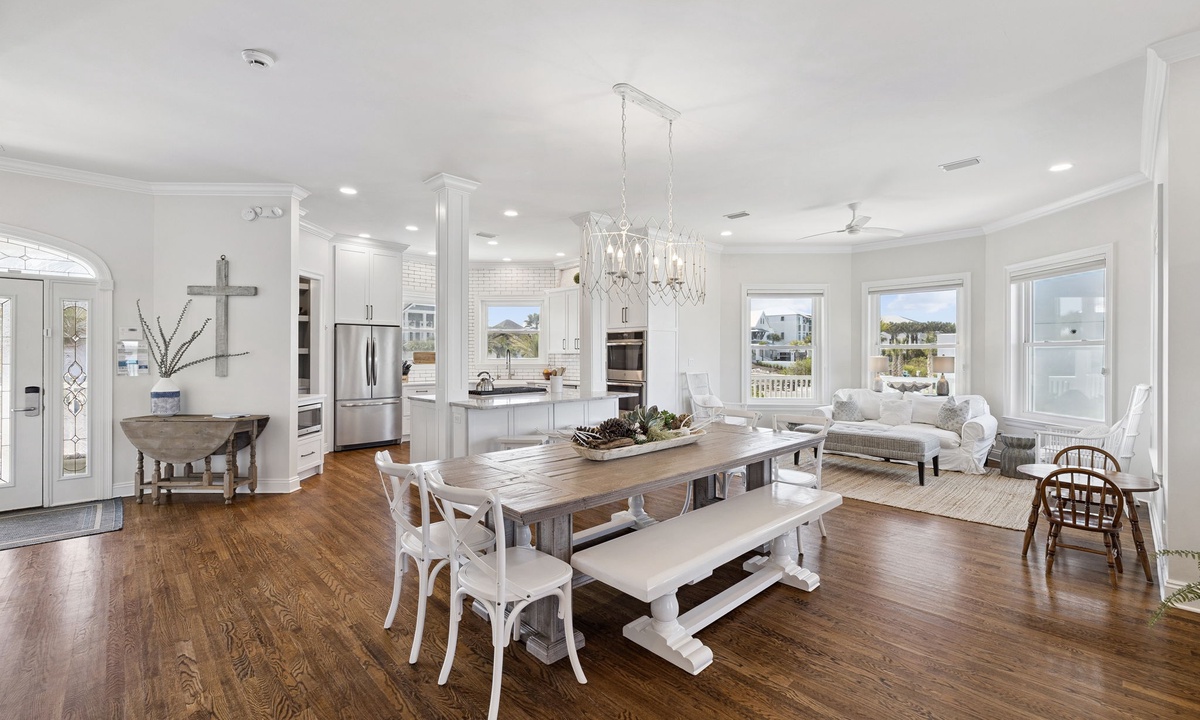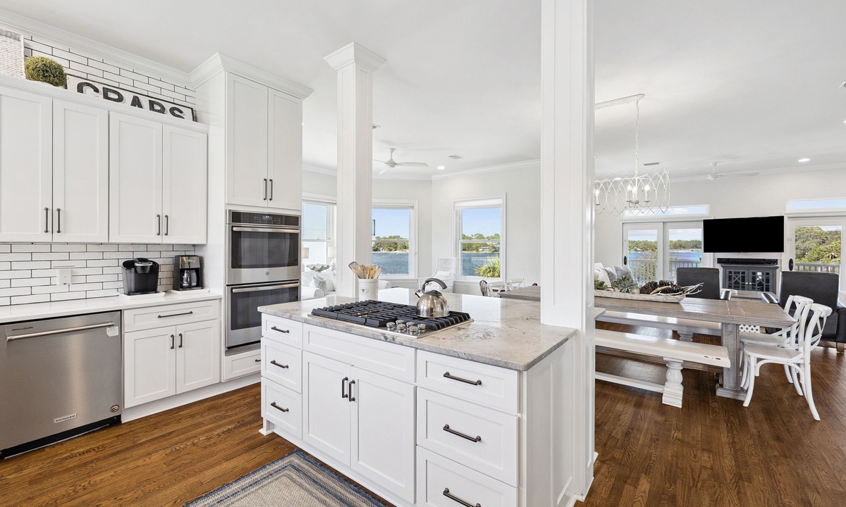 We have been coming to this home for years. It works great for multiple families or even family reunions. Our kids love to fish, kayak and paddle board in the lake. They often kayak from the back dock to the outfall and ocean (all watercraft can be easily rented, but we usually bring our own.) This home is truly the best of both worlds! The pool and hot tub are a nice options, too. The home is beautifully furnished and has designer touches throughout! With plenty of bedrooms and bathrooms this home truly accommodates a large group. The kitchen, dining and pantry are well appointed with plenty of space to cook and entertain. The bunk room on the bottom floor is my kids’ favorite to share with their friends. Toasting sunsets on the top deck are a daily must! We cannot wait until our next visit. This home and it’s location is truly special!- Lori S from Franklin, TN, Posted: