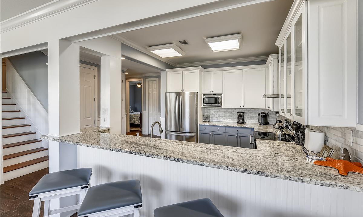 The newly remodeled kitchen is an entertainer's dream, boasting premium appliances, sleek granite countertops, and a chic dining area, complemented by additional bar seating for a casual touch.
