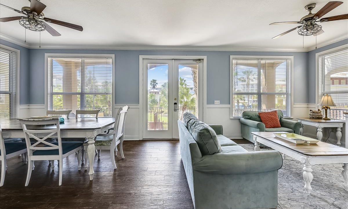 Enter a bright, open-concept living space where natural light pours in, highlighting the inviting, cozy furnishings. The first floor features plush seating and a large Smart TV, ideal for relaxing movie nights. French doors open to a tranquil patio with stunning views of the Lagoon Pool, offering the perfect retreat.