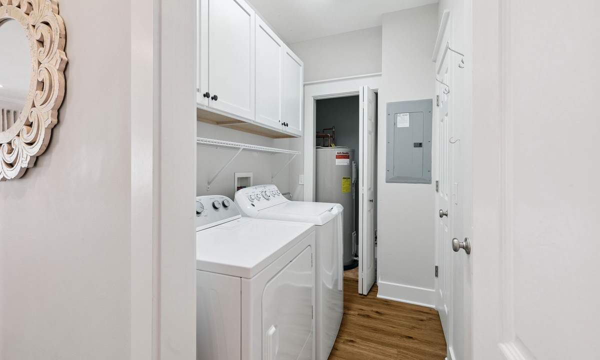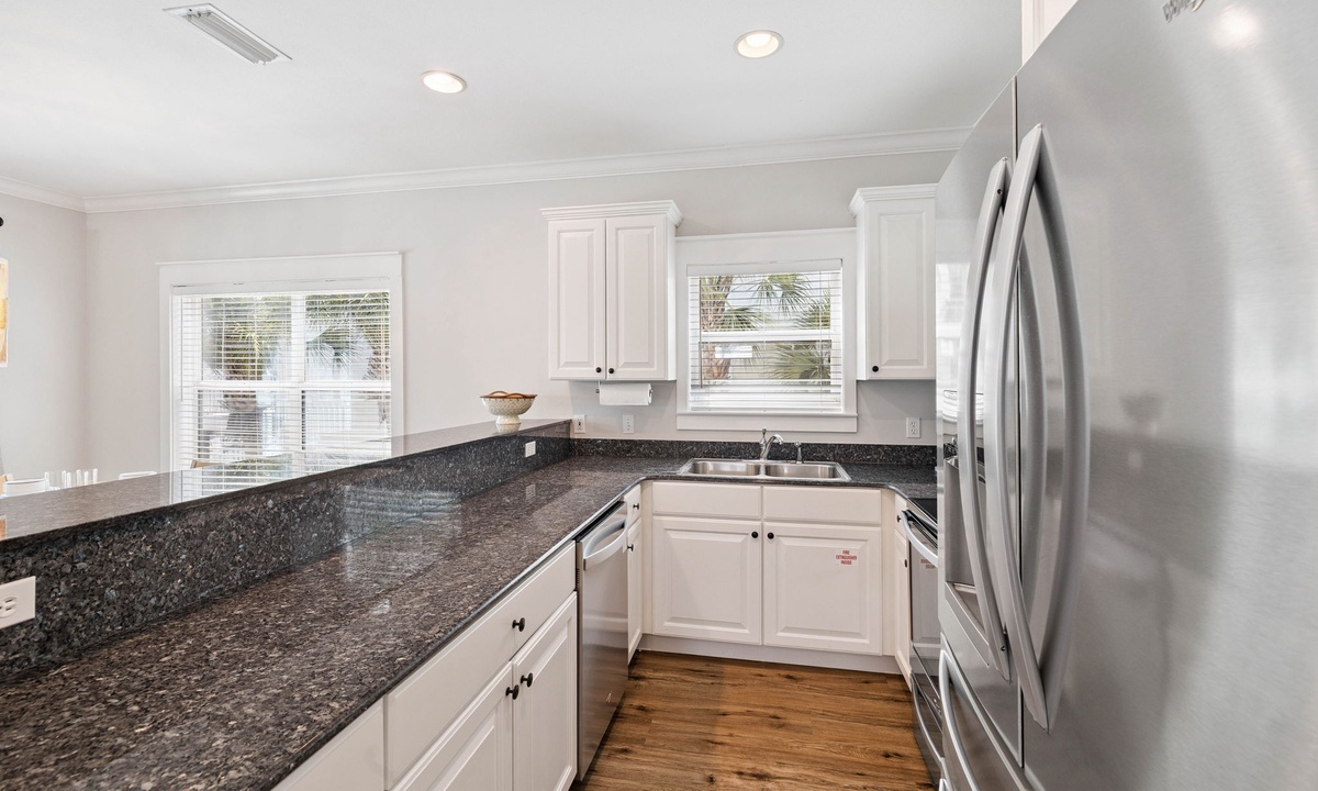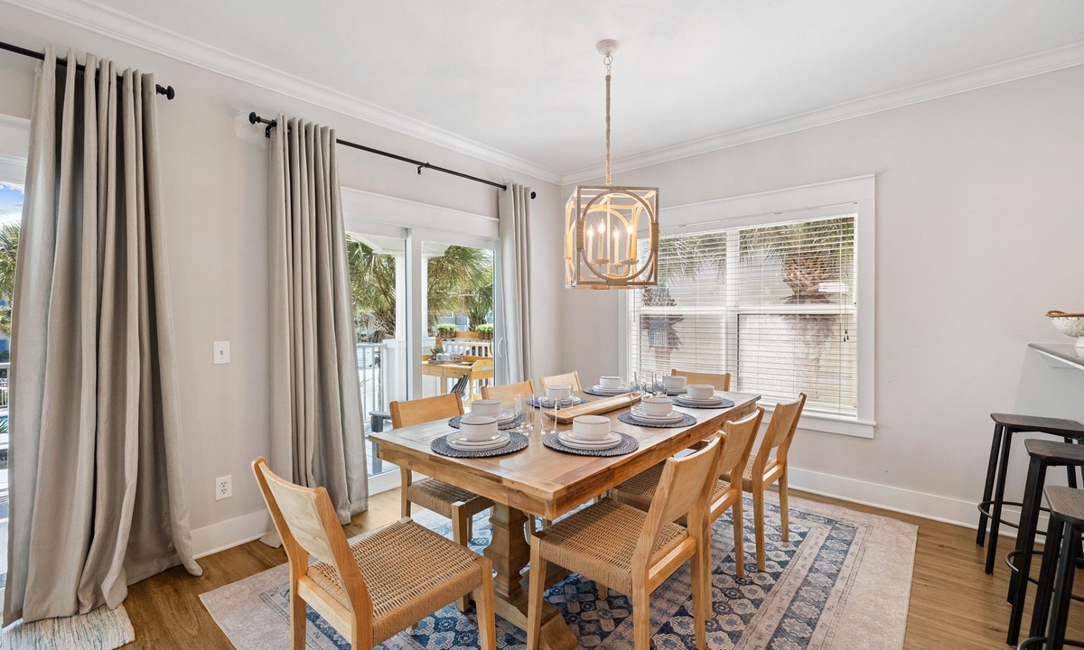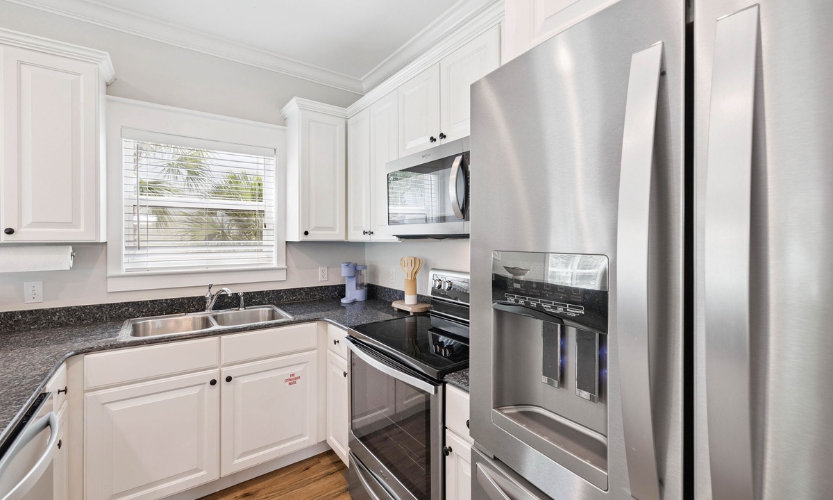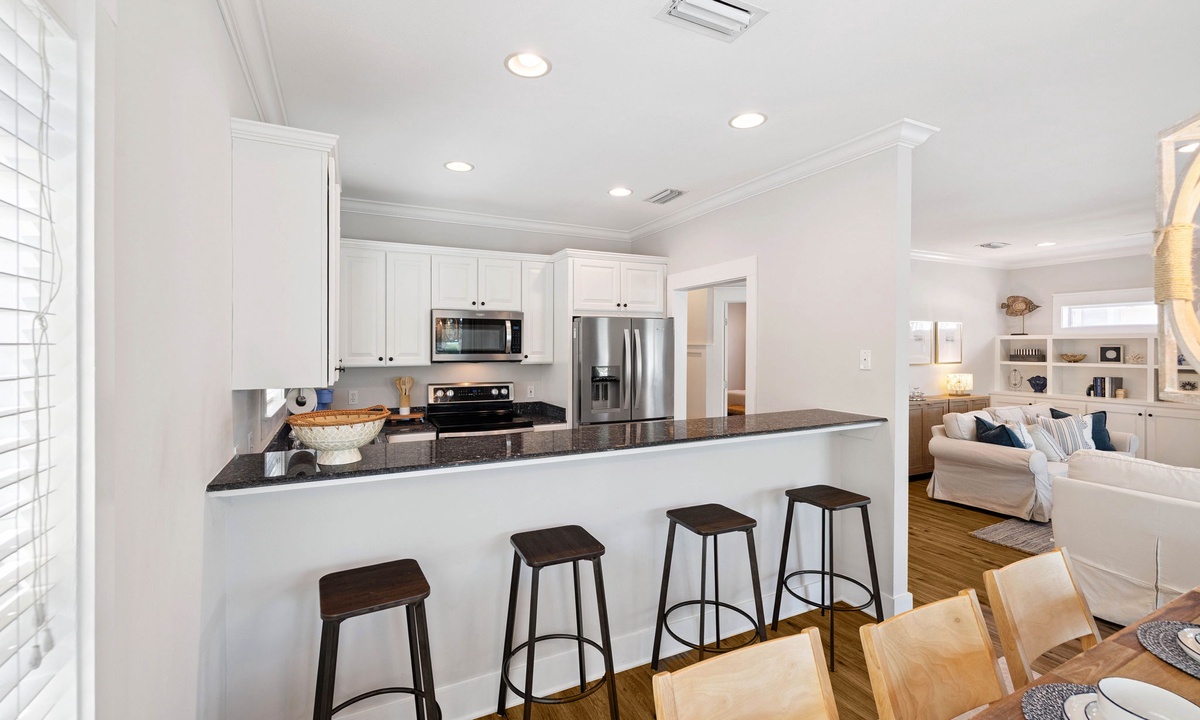 The fully equipped kitchen makes meal prep easy and fun, with stainless steel appliances and generous counter space. Enjoy casual bites at the bar or gather around the dining table for family feasts.
