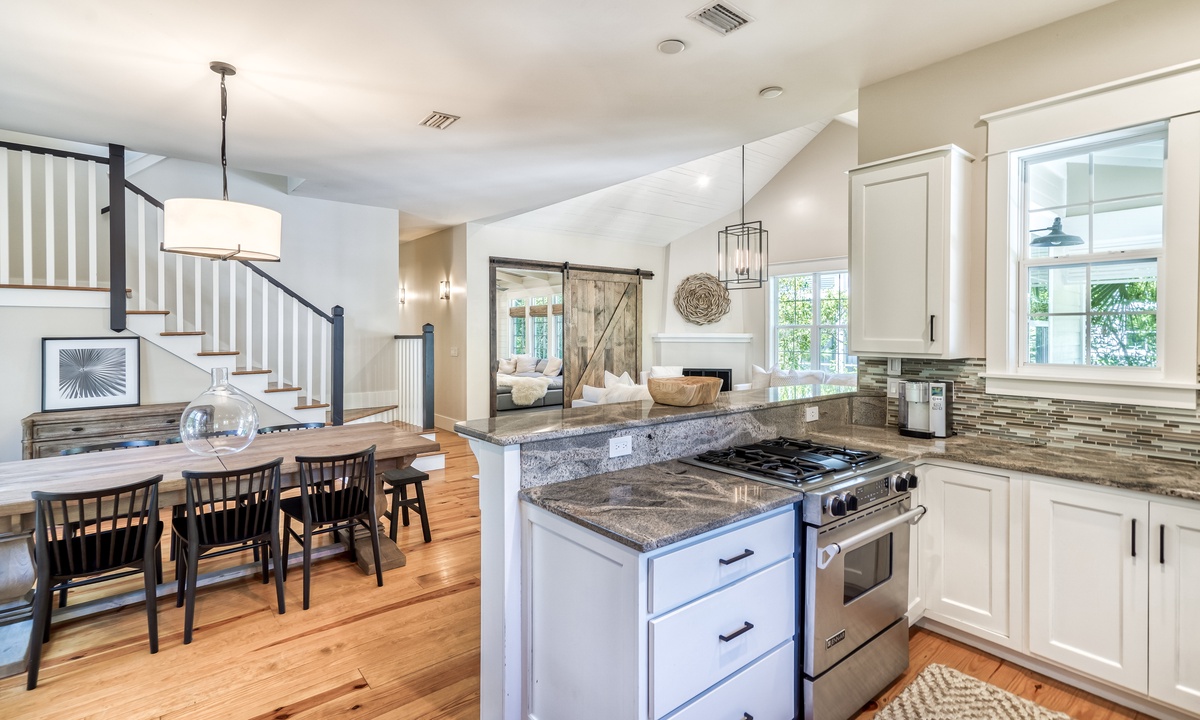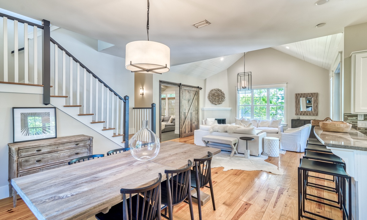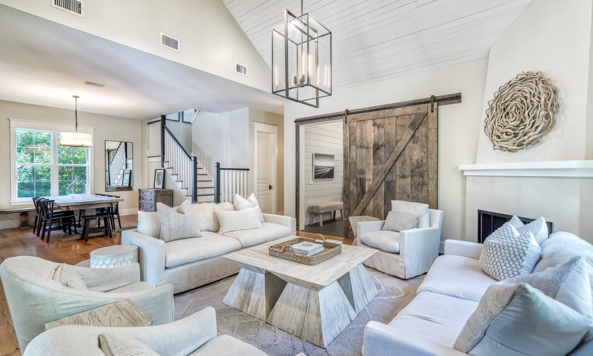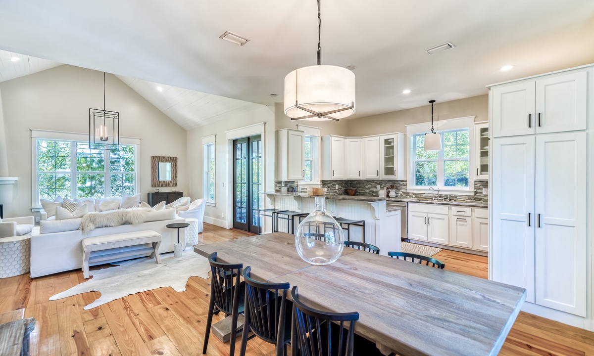 ⭐ "The layout, decor, and location of this home have made it one of our all-time favorites on 30A! The family room and kitchen area were perfect for connecting, and management was excellent!" – Eryn S.The 2 living spaces are thoughtfully crafted to blend comfort with elegance. Featuring an open-concept design, soaring vaulted ceilings, and stunning wide plank hardwood floors, every detail exudes sophistication and warmth. From the moment you step inside, you'll feel an inviting charm that makes you feel at home.