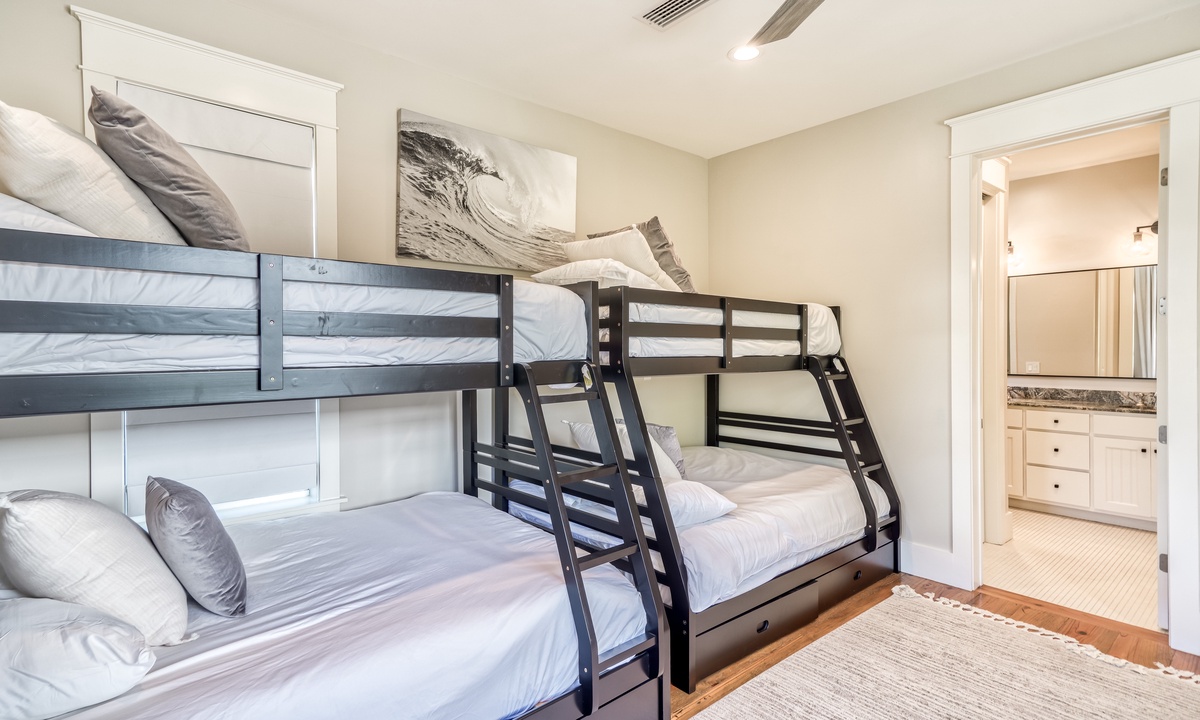 The house was exactly as shown in the photos. We really appreciated having an extra full bathroom on the first floor. There is an extra ice maker and under counter fridge in the family room bar. These come in handy with large groups. Nice private back patio with grill. It's an easy walk or bike ride to the beach, restaurants and Seaside. The kitchen had all of the necessities and all rooms were large. We didn't use the neighborhood pools, but there are 2 to choose from. The upstairs bunks are twin over full size beds. I would definitely recommend this house to anyone.- Blythe M from Dunwoody, GA, Posted: