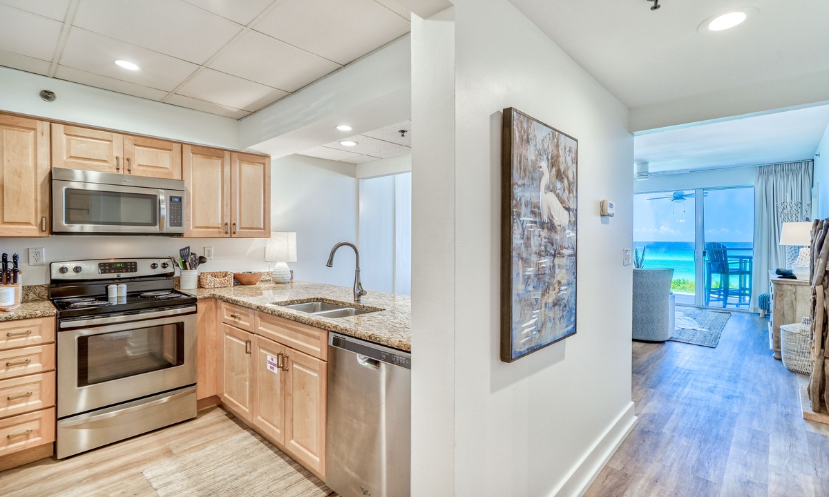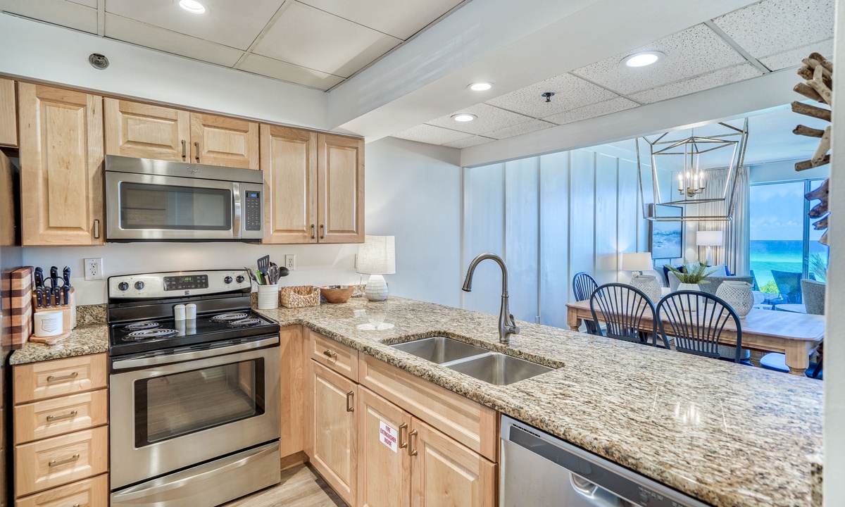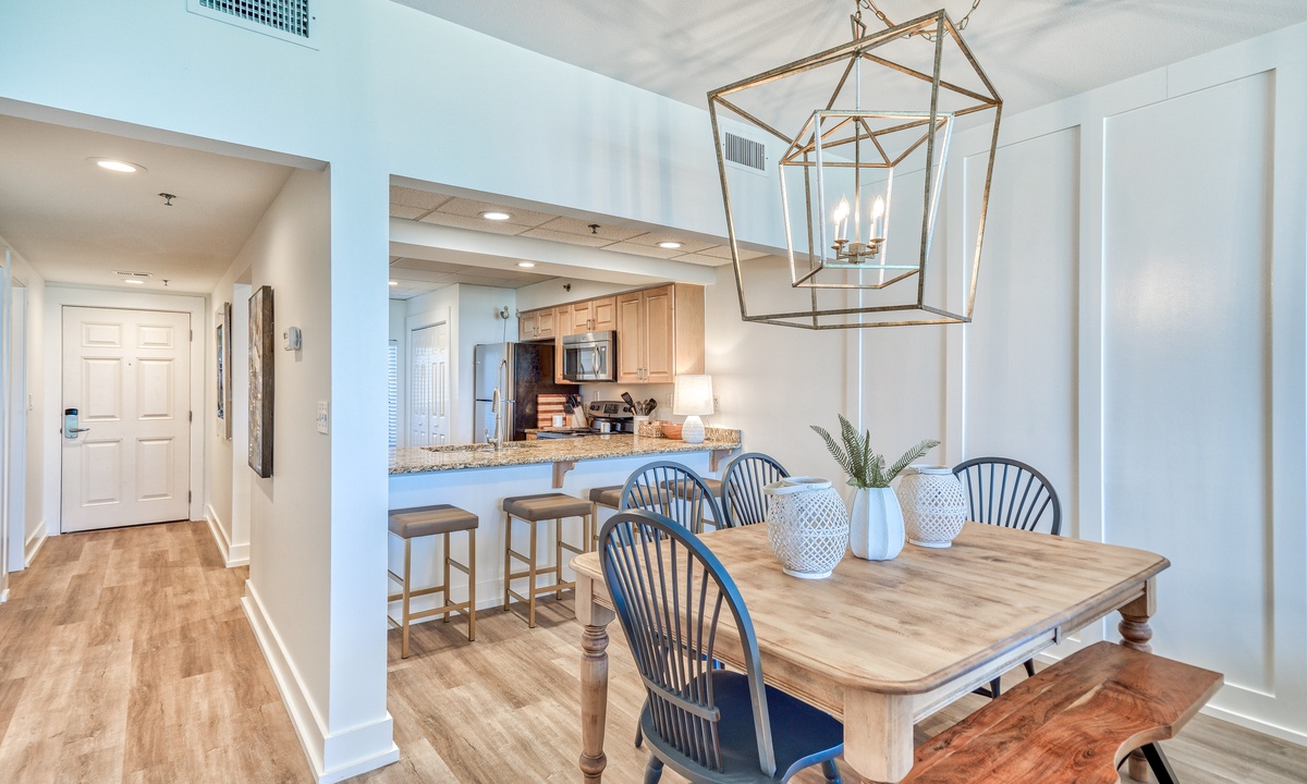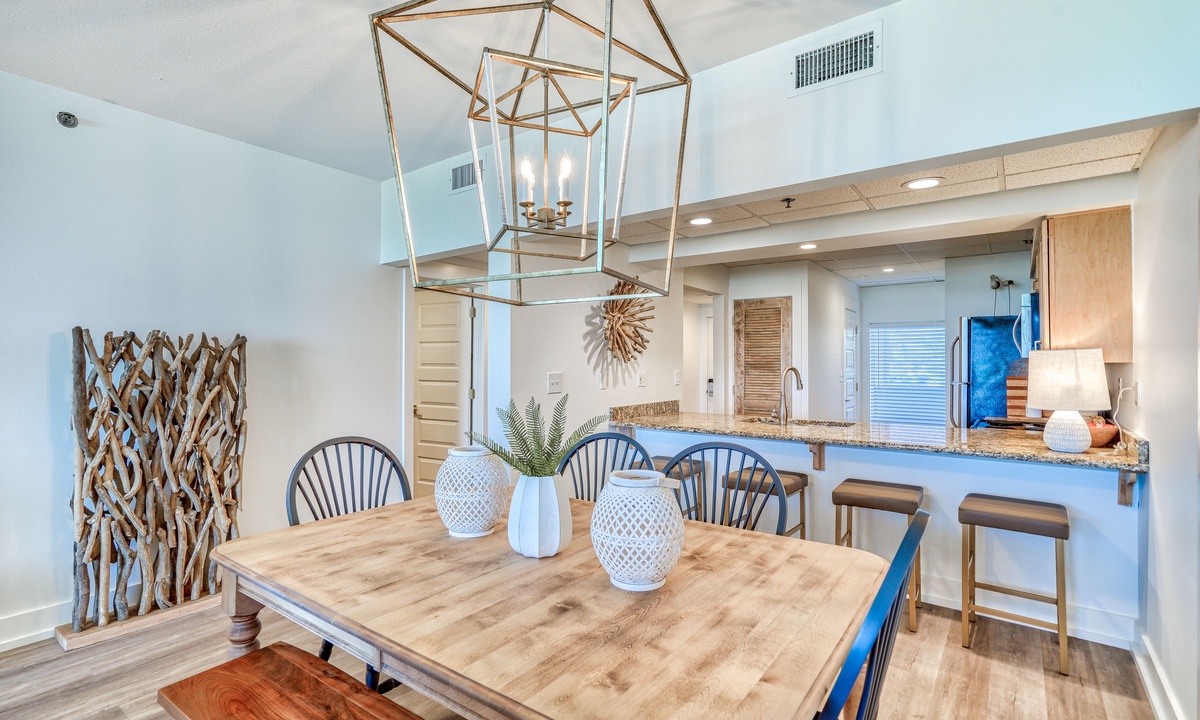 The fully equipped kitchen offers everything you need to prepare delicious meals while soaking in breathtaking Gulf views. Just steps away, the elegant dining area comfortably seats six, creating the perfect setting to turn every meal into a memorable experience.