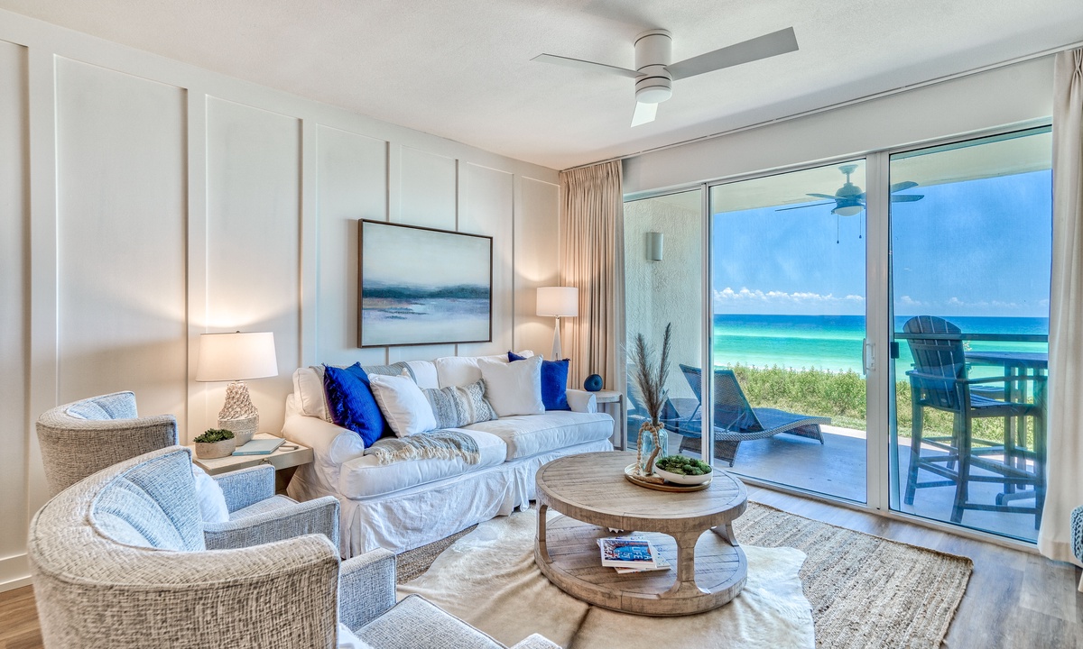 ⭐"The view was absolutely breathtaking, and the condo’s decor was stunning! It was the perfect spot for our family getaway to 30A. We can’t wait to come back!" - AshleyUnwind in a cozy yet sophisticated living space, where wall-to-wall glass doors frame stunning Gulf views. Bask in the natural light and let the serene vistas provide the perfect backdrop for relaxation after a day at the beach.