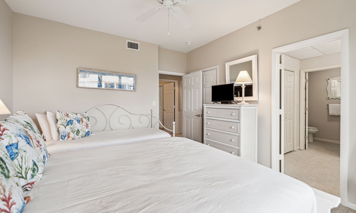 Q: What size beds are in this condo?- Merrill M. Posted: 09/30/2023A:The master (primary) bedroom will have a King size bed , The second bedroom will sleep 3 guest (1) Queen bed and (1) twin bed, The 3rd bedroom will sleep two guest with a queen bed and the Sleeper Sofa in the living room is a Queen that will sleep 2 guest.