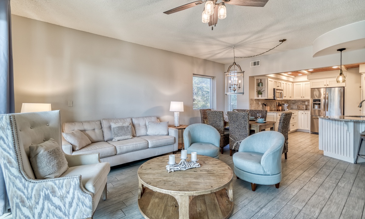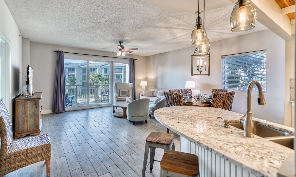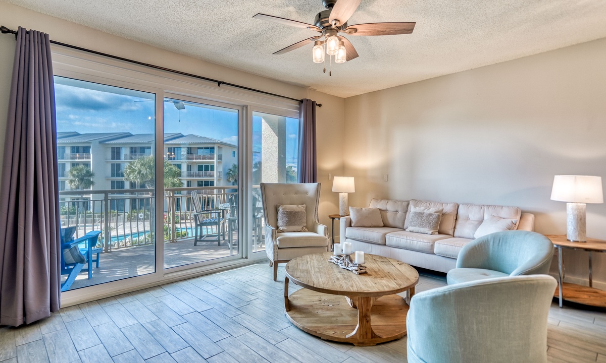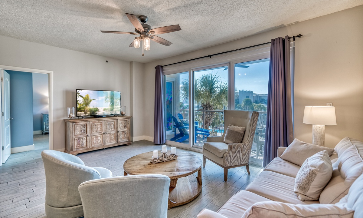⭐"The condo was absolutely stunning, with breathtaking views of the pool and beach. We can't wait to return!" – SandraIndulge in modern coastal elegance with open, light-filled living spaces crafted for ultimate relaxation. The living room invites you to sink into luxurious plush seating, enjoy entertainment on the flat-screen TV, or step through the sliding doors onto a private balcony. From there, take in breathtaking views of the sparkling lagoon-like pool—your perfect retreat after a sun-soaked day at the beach!