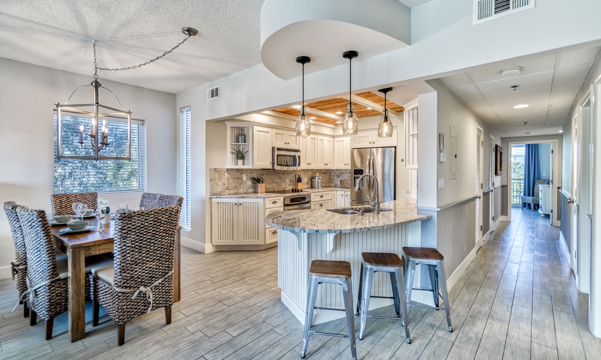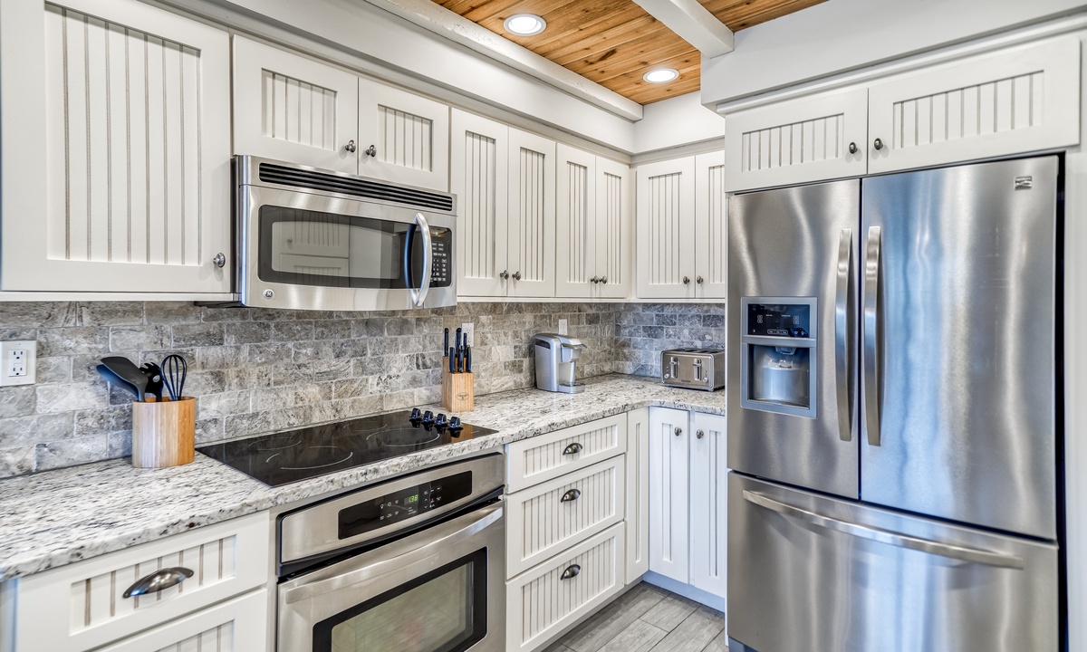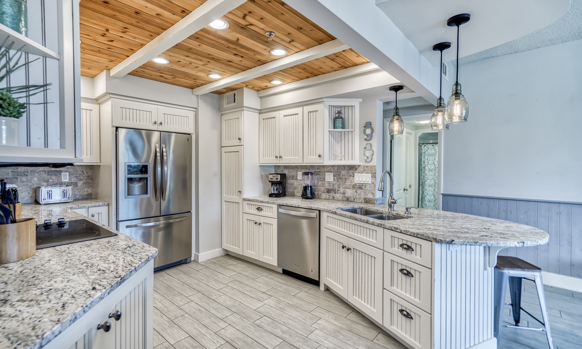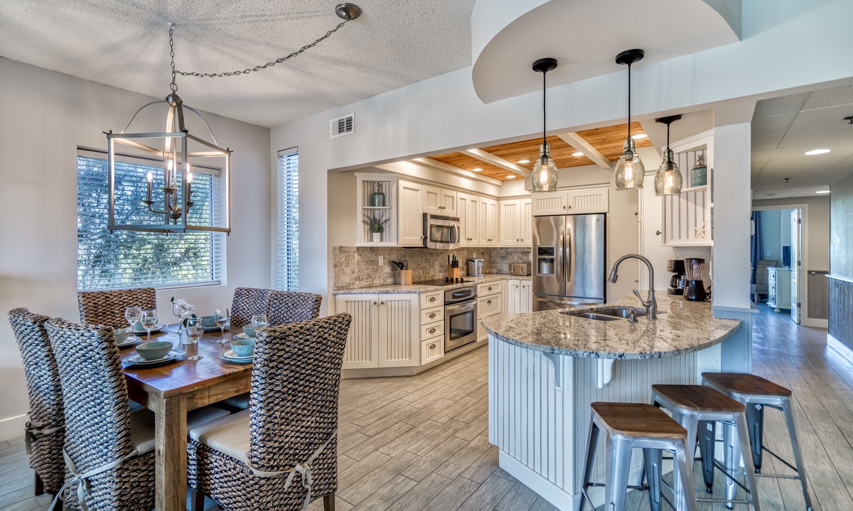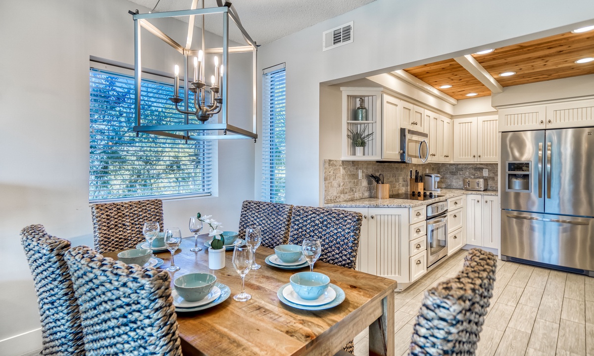 Cook up a feast or prepare light snacks in the freshly remodeled kitchen. With stainless steel appliances and plenty of counter space, this kitchen is both functional and beautiful. Gather around the large dining table to share meals or your latest beach adventures!