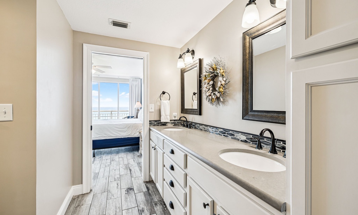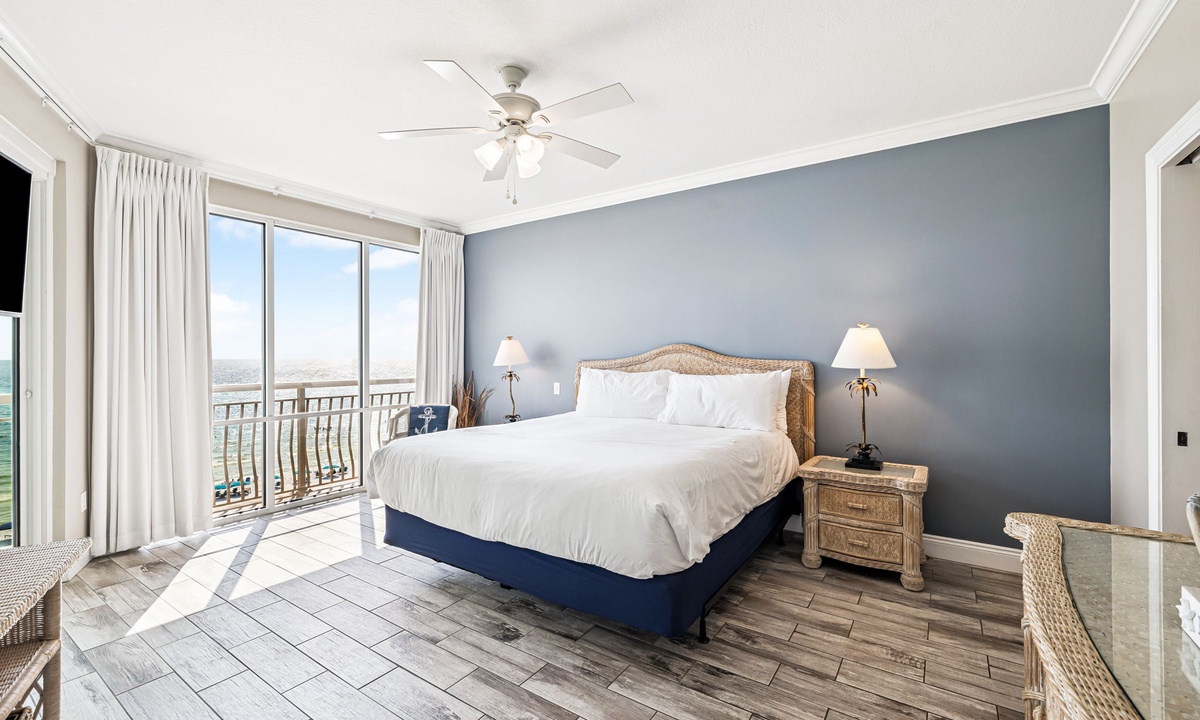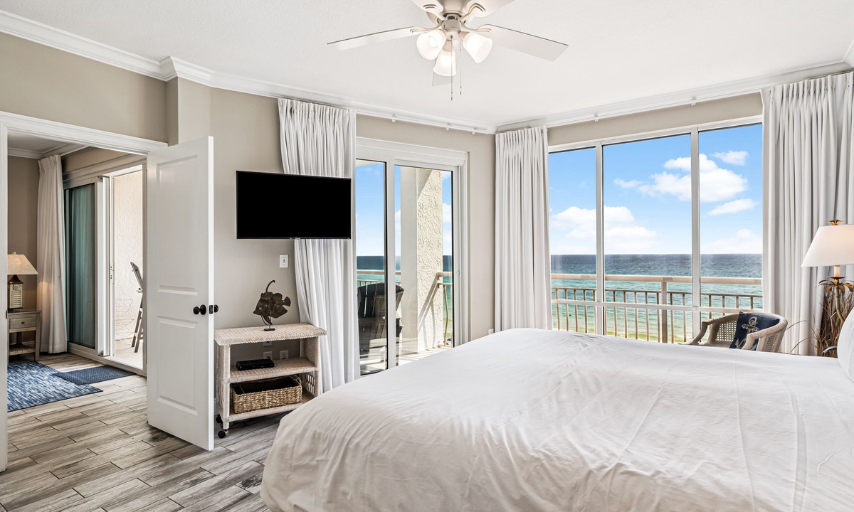 - Primary King Suite — King bed, flat-screen TV, Gulf-front balcony access, and en-suite bathroom with dual vanities and a walk-in shower