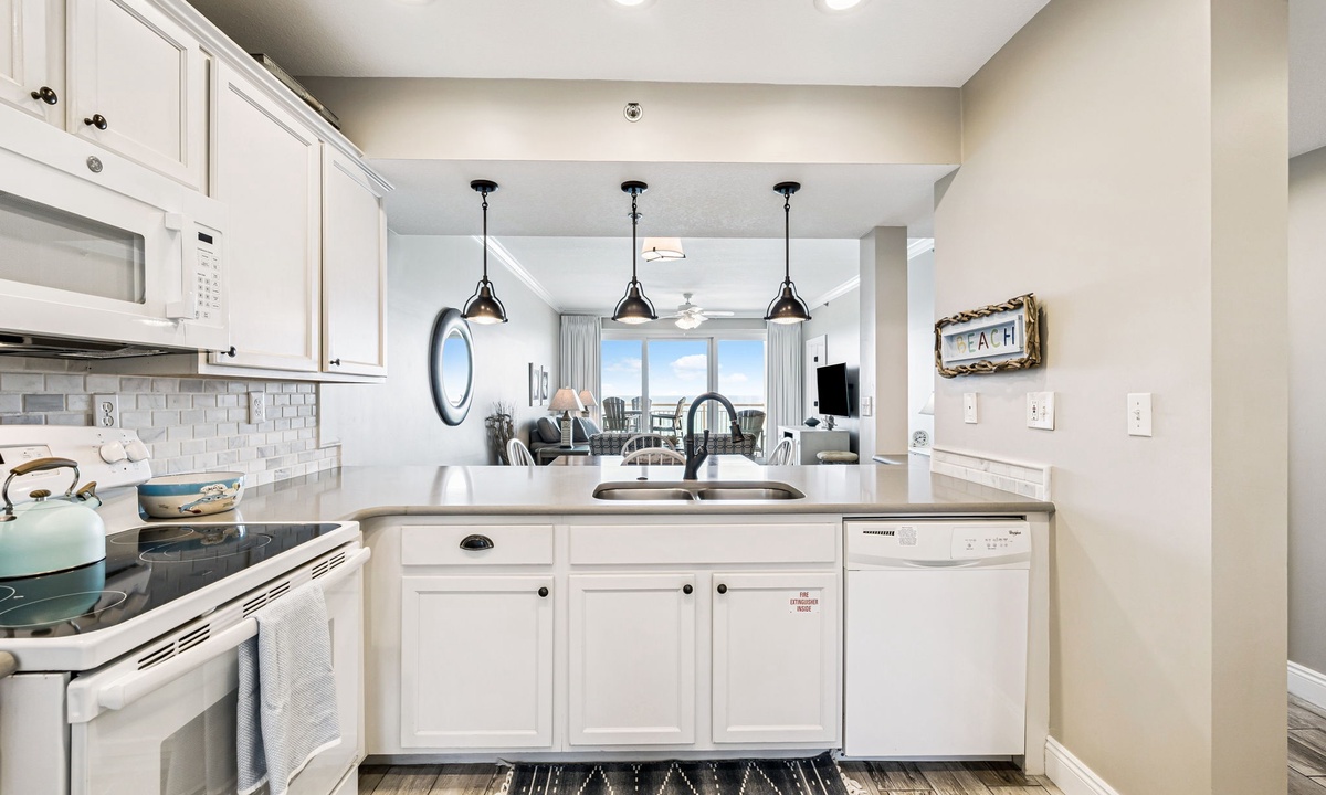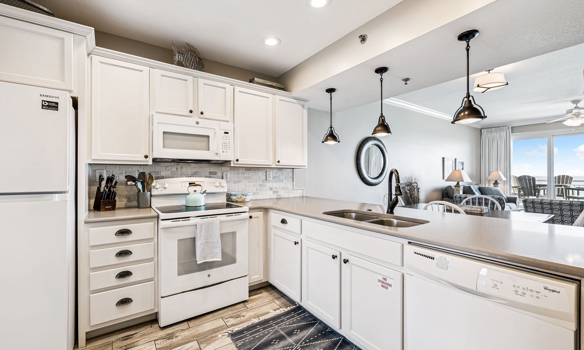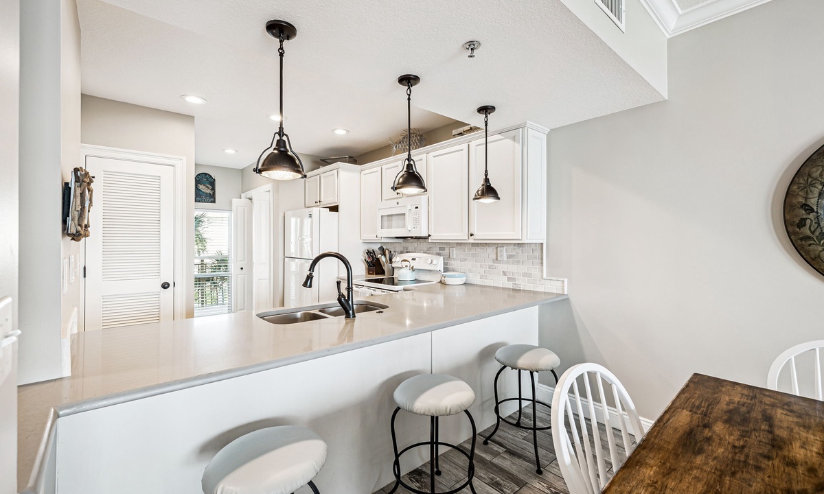 - Fully Equipped Kitchen — Generous counter space, storage, and bar seating for 3