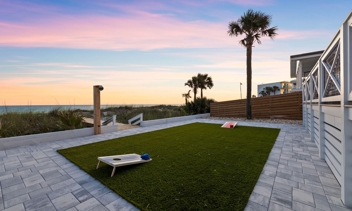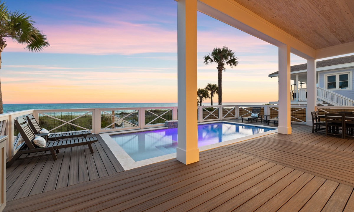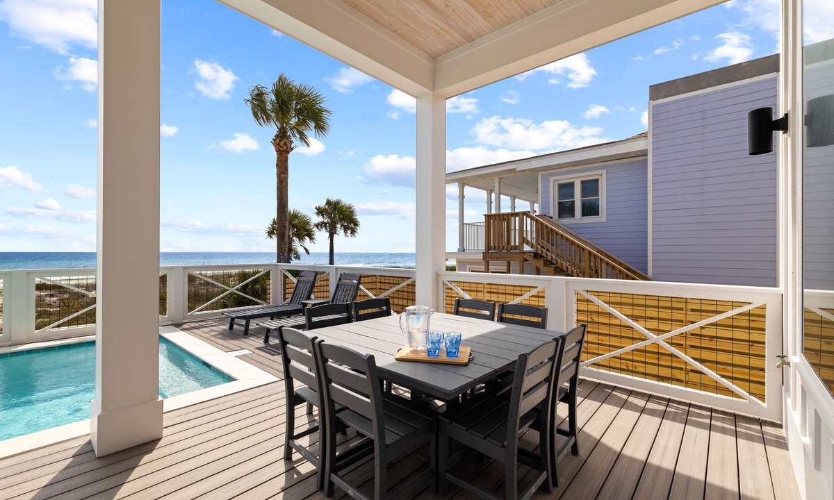 Step out onto the patio and into your personal Gulf-front oasis. With a large heated saltwater pool, direct beach access, seasonal beach service, and open play areas, this outdoor space seamlessly blends relaxation with entertainment.