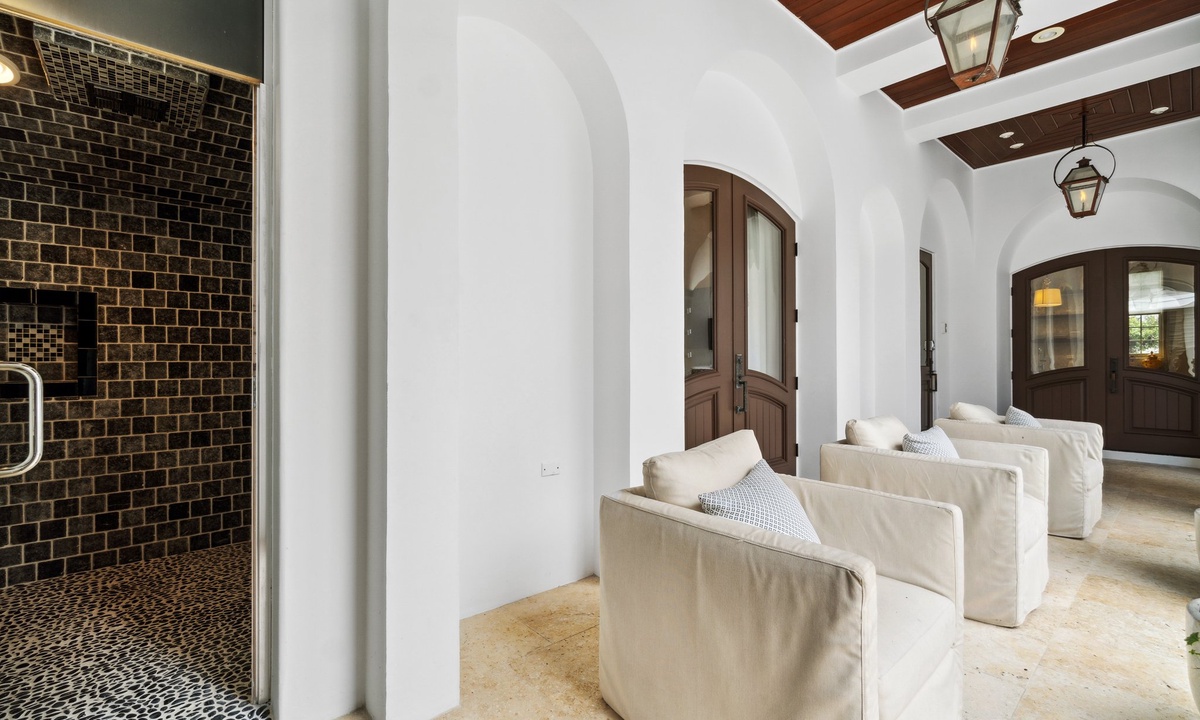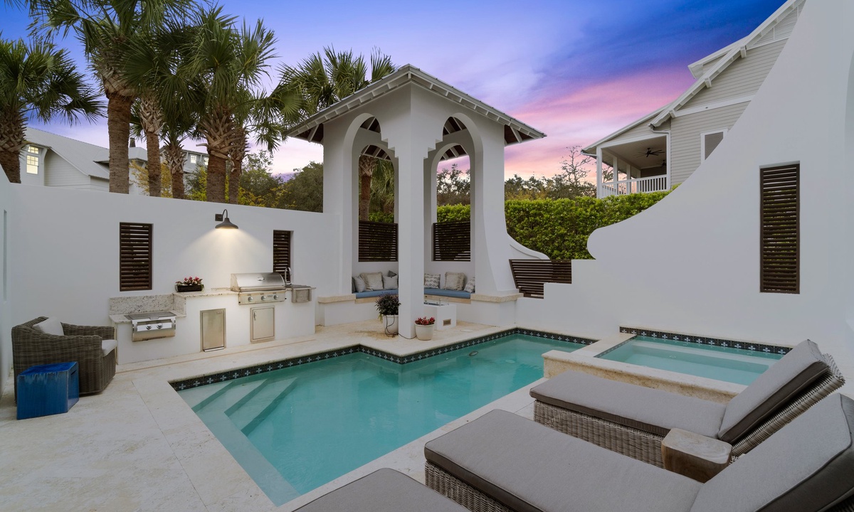 Escape to a serene private outdoor courtyard designed for ultimate relaxation. Take a dip in the heated pool, soak away your stress in the luxurious spa, or lounge in one of the cozy seating areas surrounded by tranquil vibes. Fire up the grill in the covered cooking area and savor a delicious meal. End your day unwinding under the starry sky in the soothing warmth of the outdoor sauna—your perfect retreat awaits.