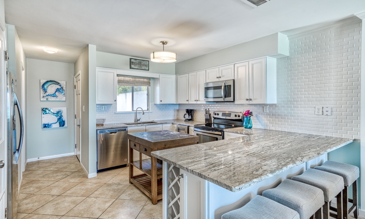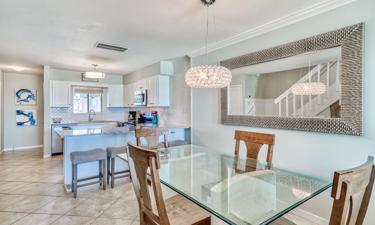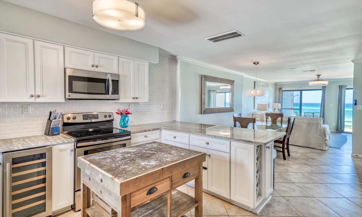 Create mouthwatering dishes in a modern, fully equipped kitchen featuring stainless steel appliances and generous counter space. The spacious dining table nearby offers an inviting setting for shared meals, all while taking in stunning Gulf views.