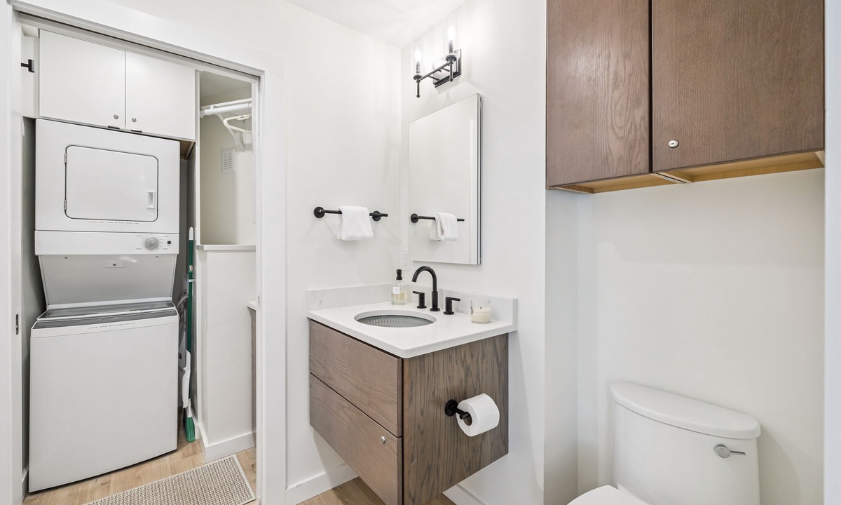 - Convenient powder room and stacked washer and dryer located just off the kitchen