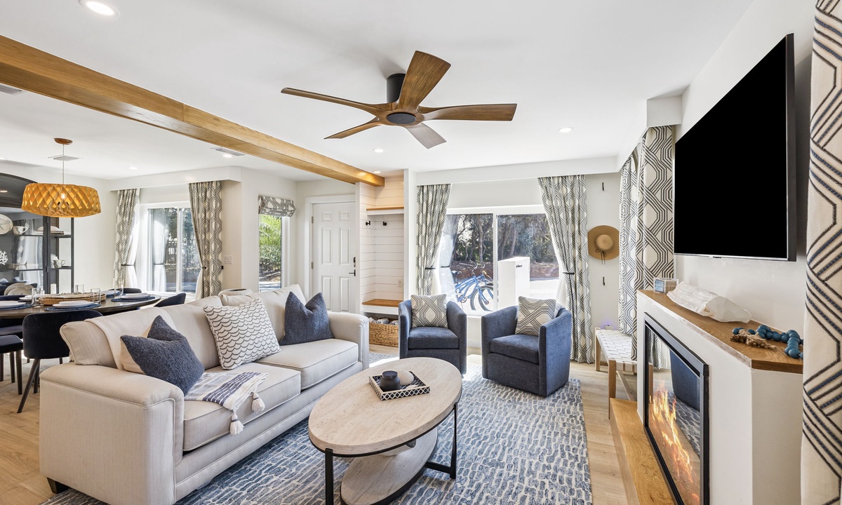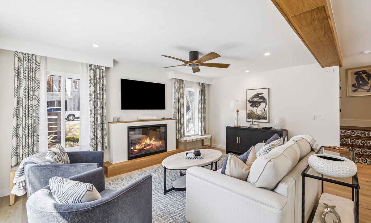 - Electric fireplace creating a warm coastal ambiance
