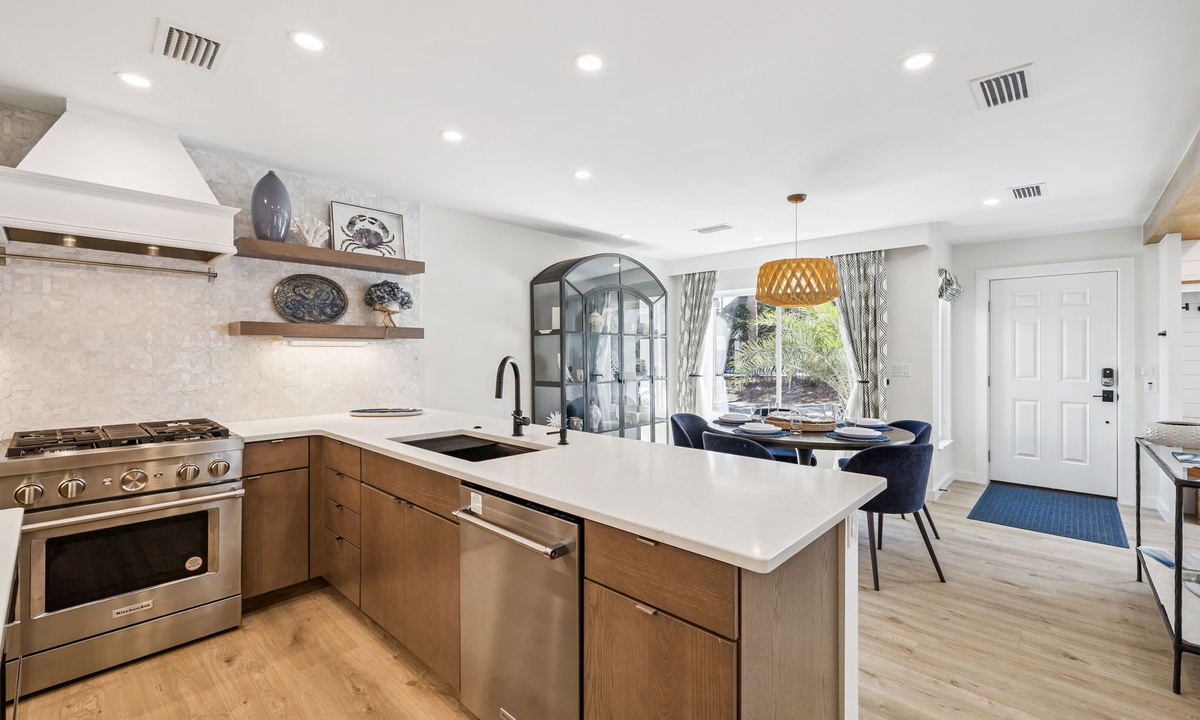 *** KITCHEN AND DINING ***The thoughtfully designed kitchen is both beautiful and functional, offering everything needed for relaxed coastal meals or an intimate dinner after a day by the beach. Generous counter space, stainless steel appliances and a built-in wine cooler make cooking and entertaining effortless.