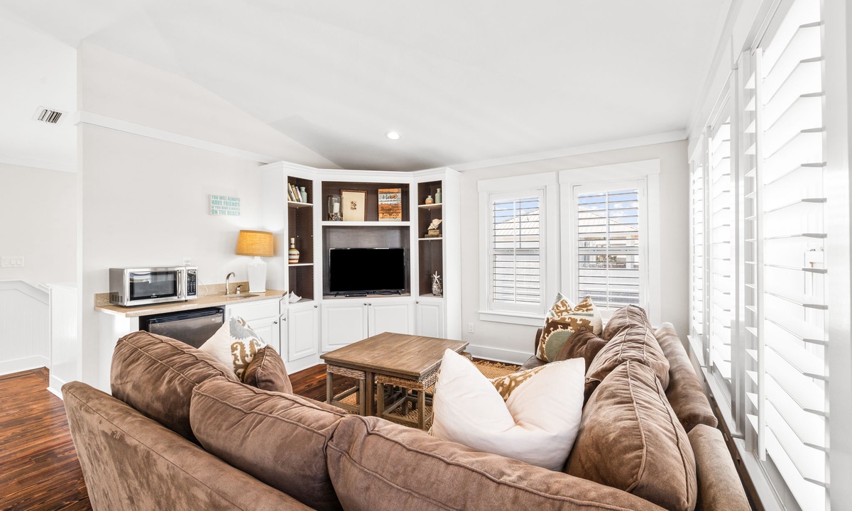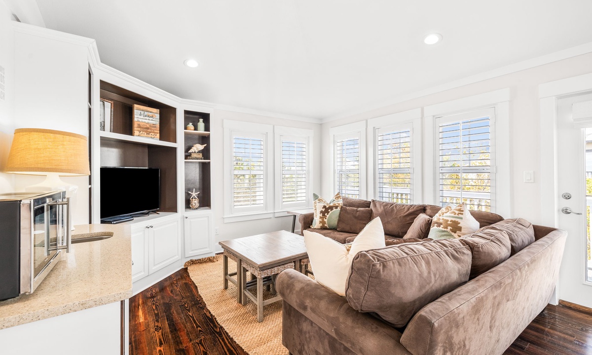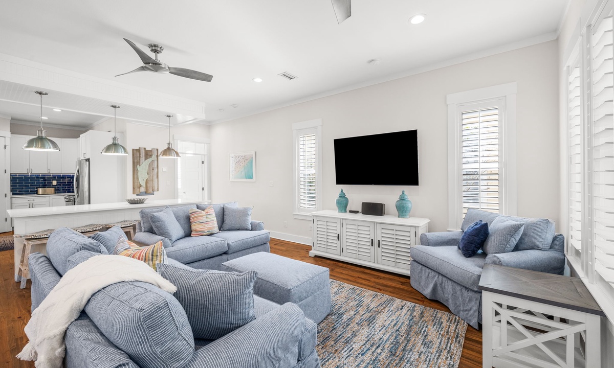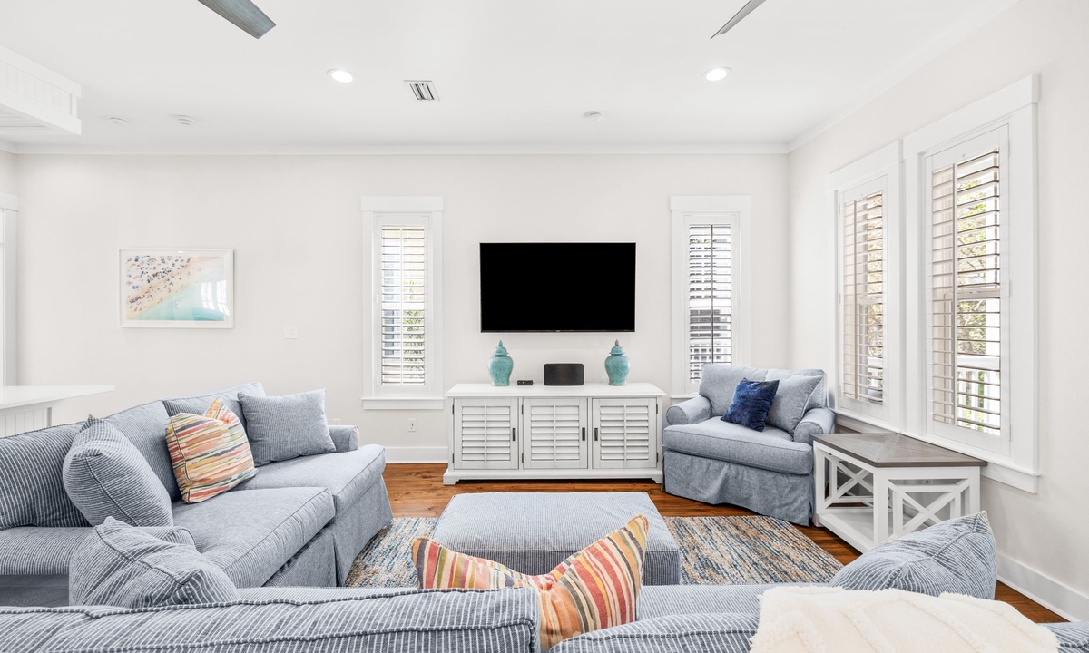 - 1st Floor Living Room: Cozy coastal furnishings, flat-screen TV, access to porch