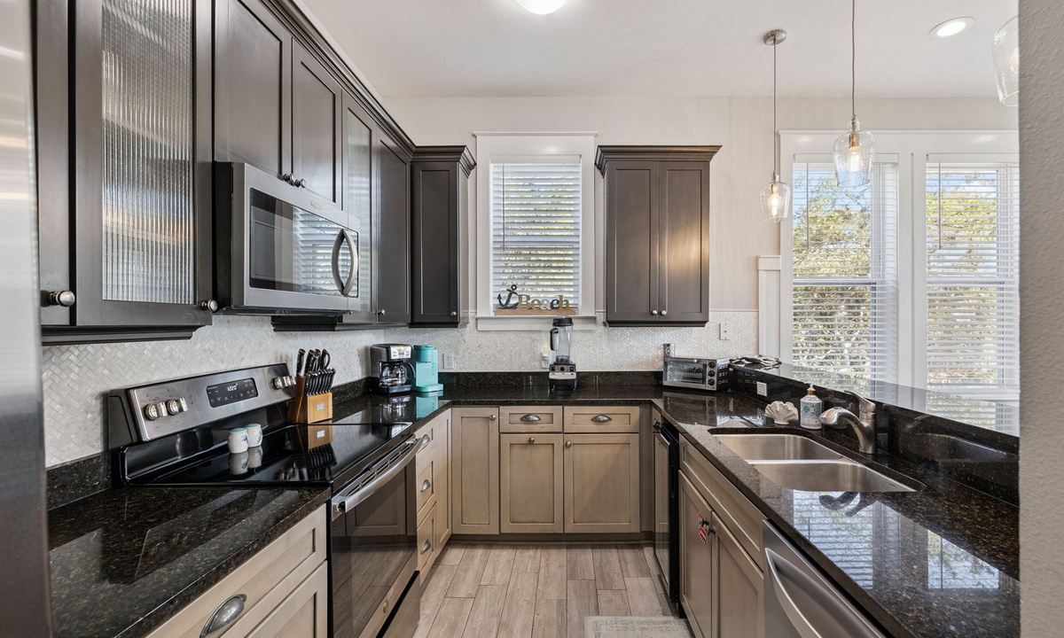 This house was beautiful! We stayed in and cooked a lot, the kitchen had everything you needed. The rooms were spacious. With 9 kids in the house everyone was able to spread out and enjoy some quiet time. The location was a dream. We had small children and were able to walk to the beach without complaining kids. The pool is across the street which is also nice. Our older kids enjoyed riding their bikes to the convenient town!