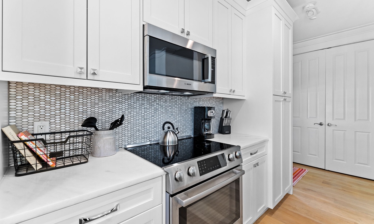 This updated kitchen is a dream for anyone who loves to cook or share meals with loved ones. Outfitted with stainless steel appliances and seating for four at the kitchen island, every detail has been thoughtfully designed for your culinary convenience.