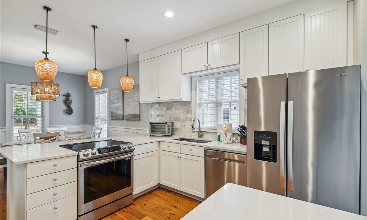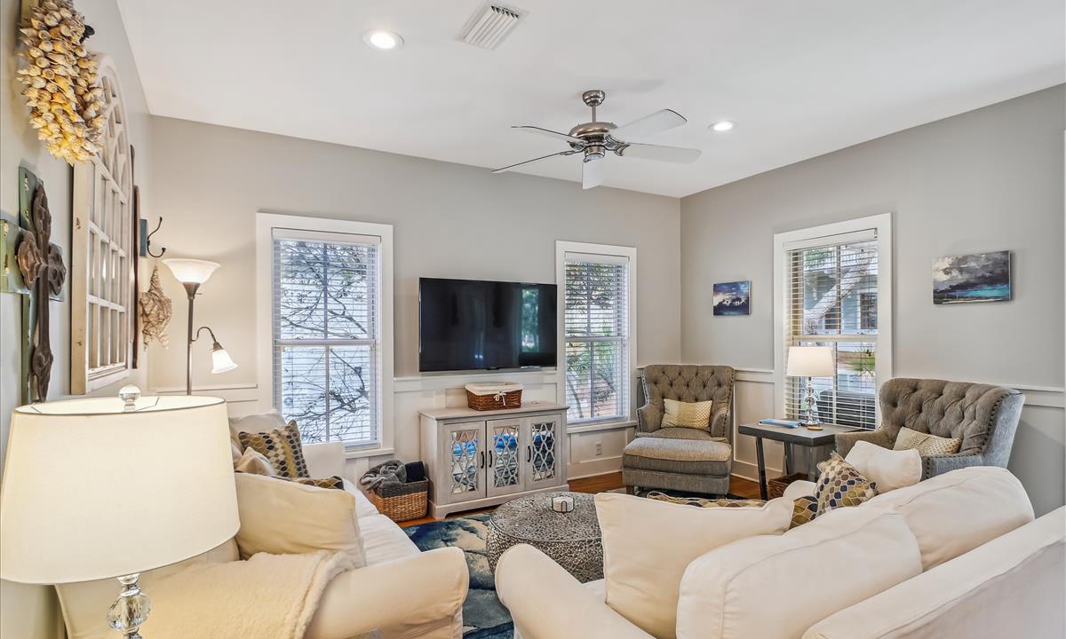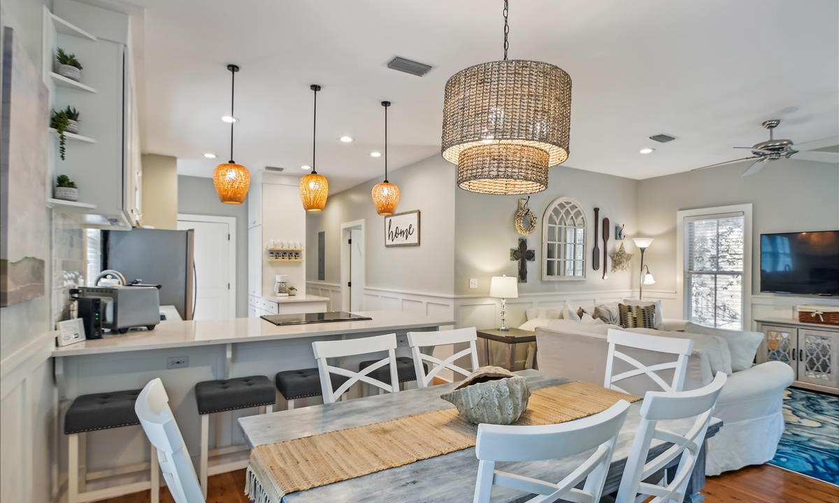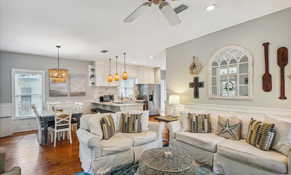 ⭐ “We had a wonderful time. The house was perfect and close to so many things!” - Lena W.The living area, the heart of the home, offers a bright and inviting atmosphere, complete with cozy, beach-inspired furniture that’s perfect for unwinding after a sun-filled day. Relax in this serene space with a cup of coffee while enjoying your favorite movies on the Roku-enabled TV.