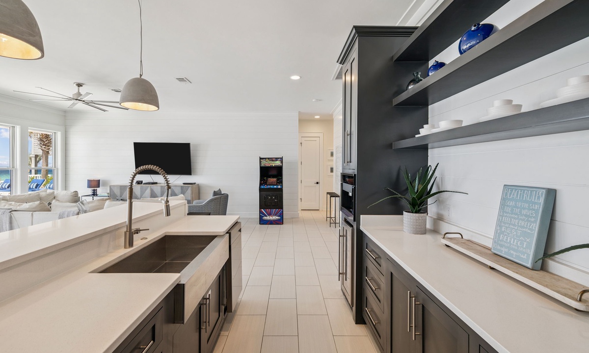 With 6 adults and 2 grandkids ages 6 & 9, we were looking for someplace on the beach that felt more like home than a rental. This house did more than that. It came with everything a family needed to have the most enjoyable vacation imaginable. The kids loved the arcades. The adults loved the ping pong and pool tables for when we weren't at the beach. I loved the elevator, since it was a 3-story house, and my knees aren't what they used to be. The beach set up every day that we were there was amazing. No more carrying our own chairs back and forth. The big ice machine in the garage kept us ready to make margaritas or fill an ice chest. Enough bikes for everyone to ride. But the house itself had that beach feel that was open and airy. Two well stocked kitchens. The pool was awesome!!! It was heated and the kids swam in it since the ocean was too cold for them. We lacked for nothing. We're definitely coming back next year!!!- Anonymous U , Posted: