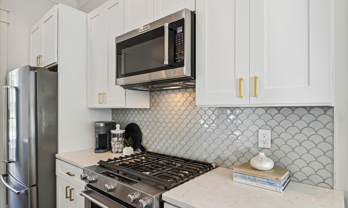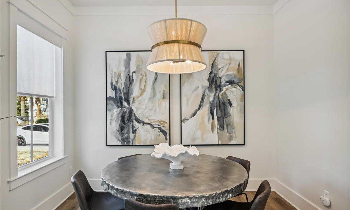 Create gourmet meals or enjoy your favorite takeout in this beautifully designed kitchen. With sleek stainless steel appliances, a coastal-inspired mermaid tile backsplash, and a spacious center island with bar seating, it blends style and function. The dining area features a round table for six, plus three barstools at the island—perfect for family gatherings or weekend brunches.