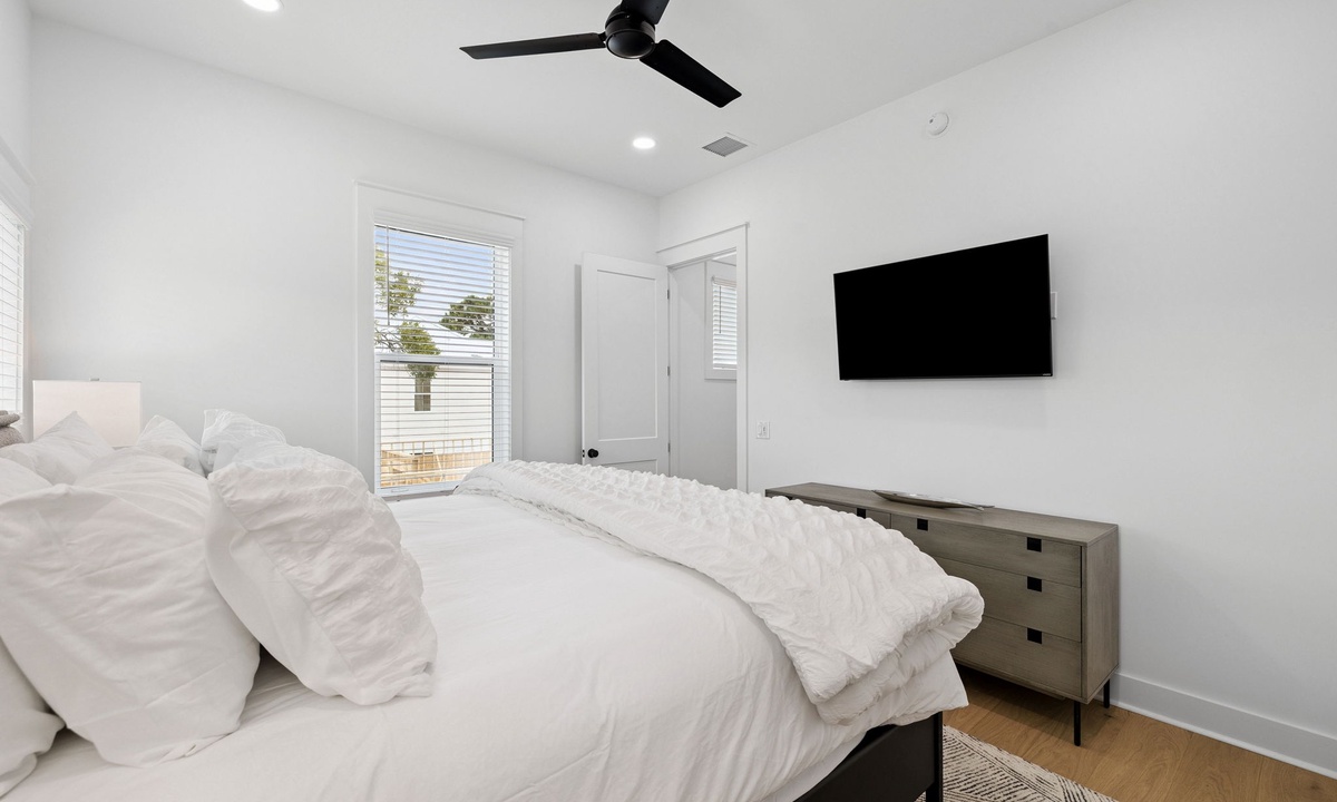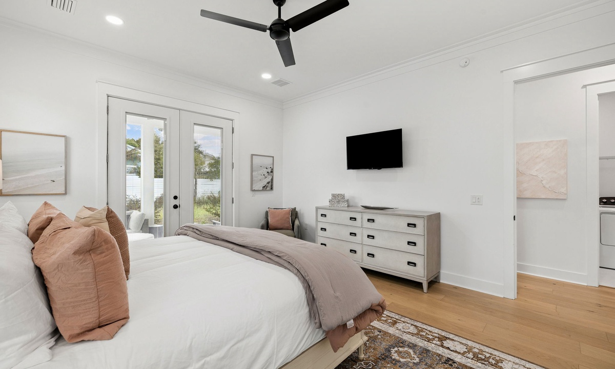 - Primary King Suite: King bed, flat-screen TV, patio access and En-Suite with dual vanities and walk-in shower