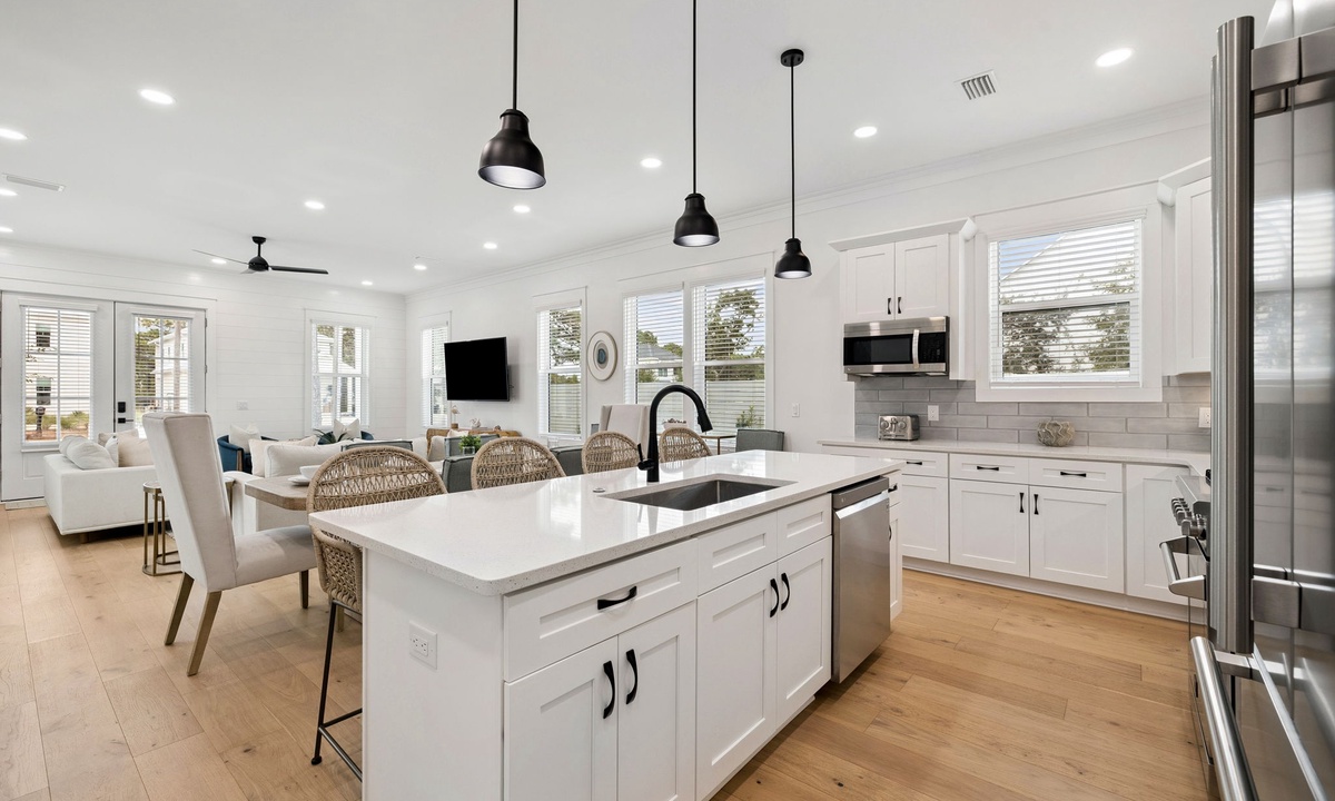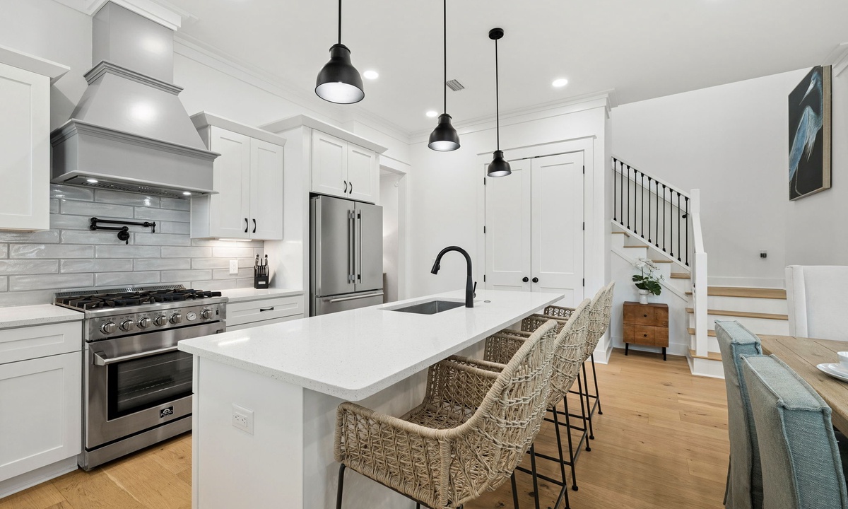 - Chef-Style Kitchen – Stainless appliances, bar seating, and dining for 6