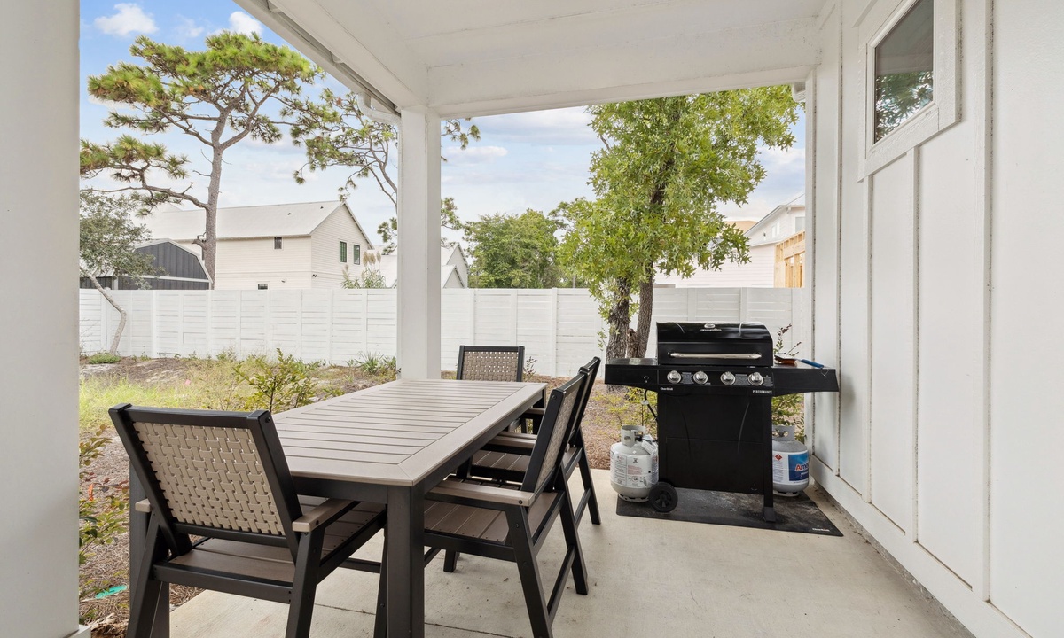 - Fenced-In Backyard – Spacious patio with gas grill, al fresco dining for 6 & outdoor shower