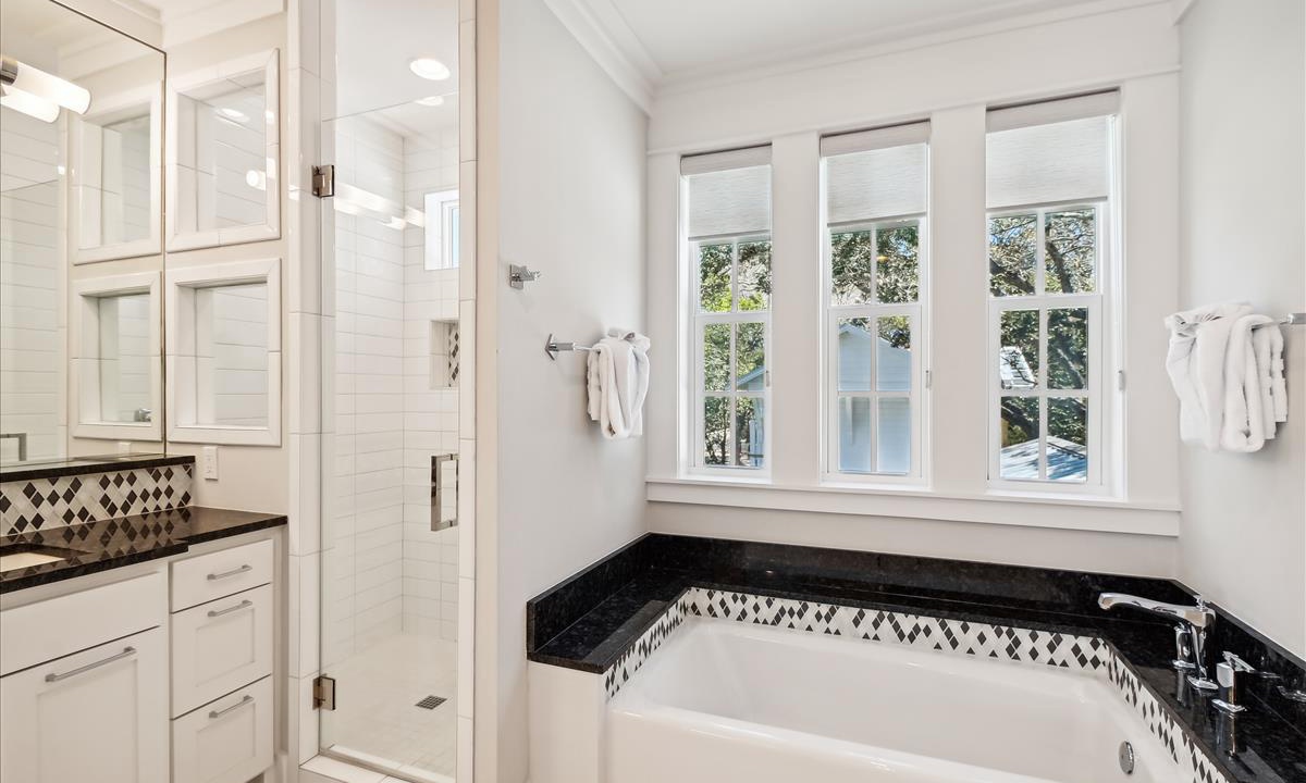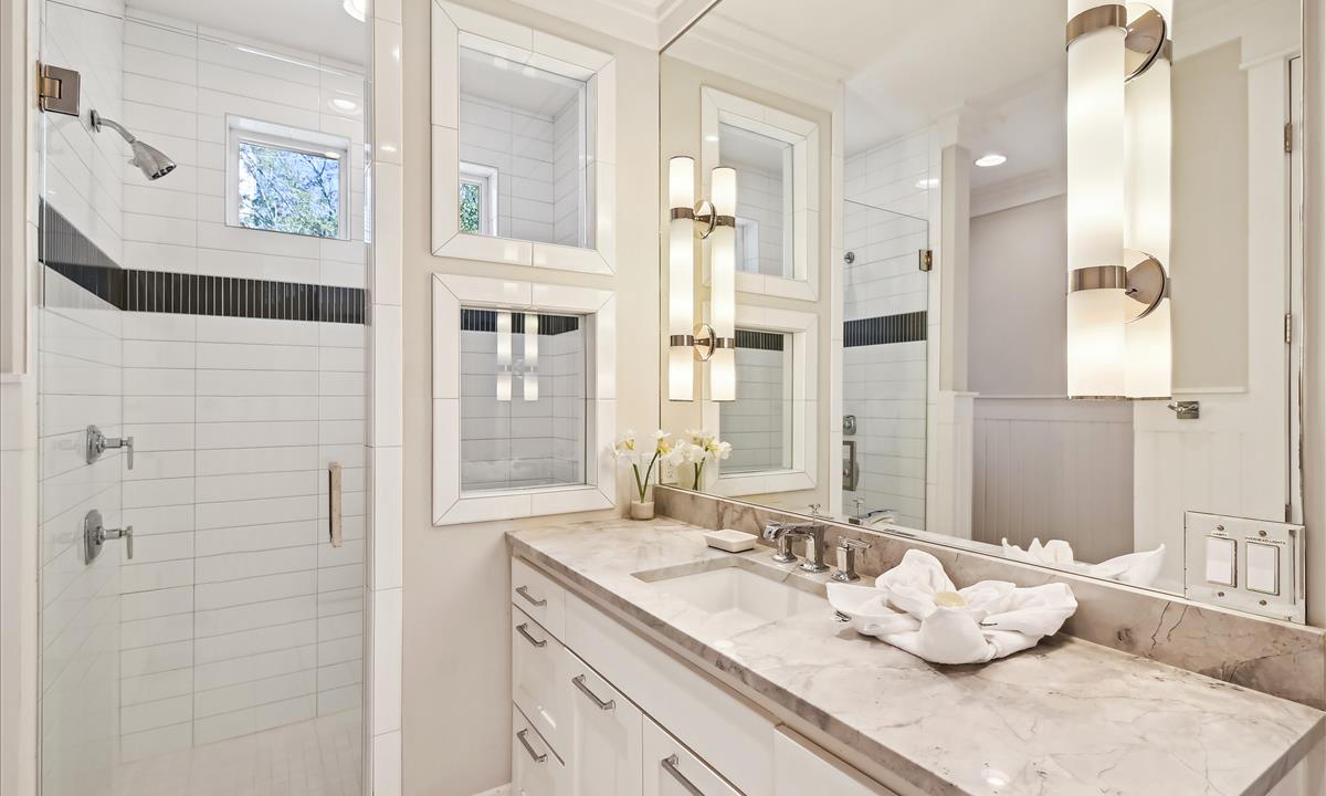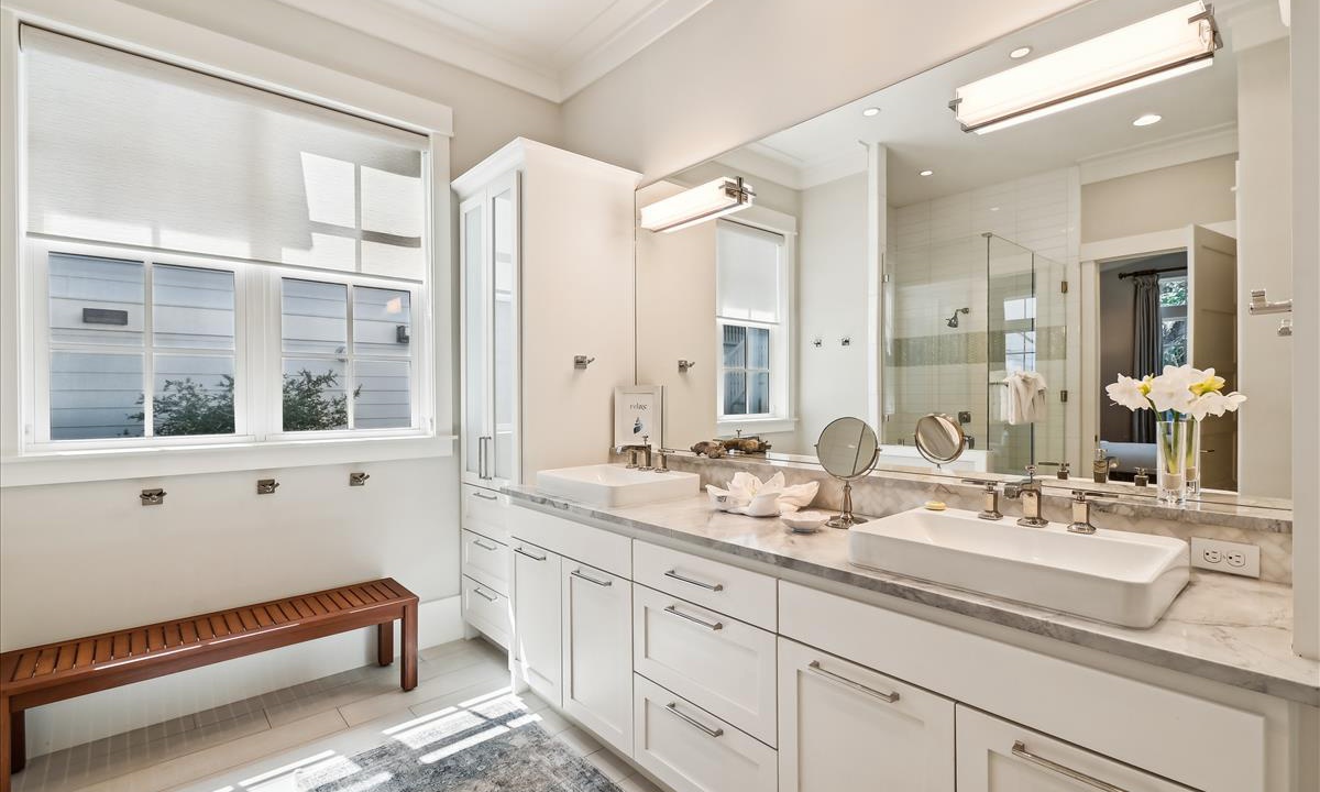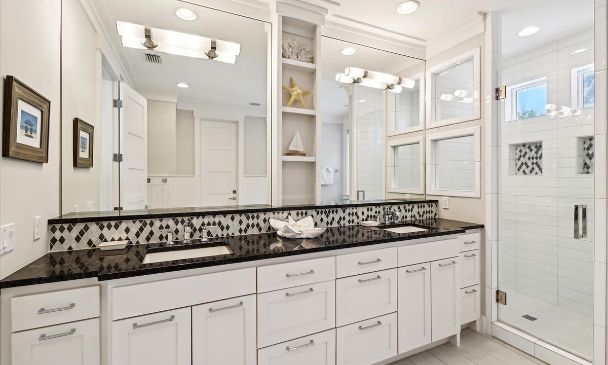 - Hall Guest Bathroom: Dual vanities, walk-in shower and soaking tub shared between both Bunk Rooms.