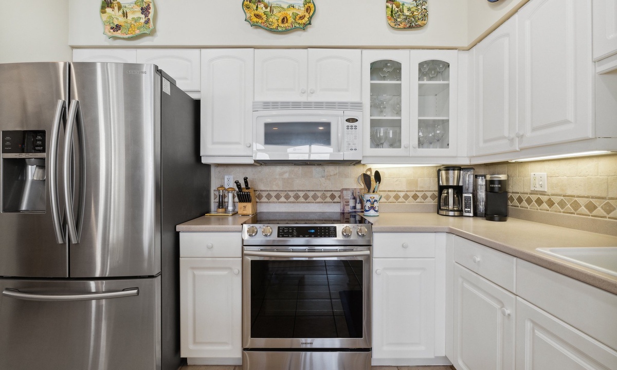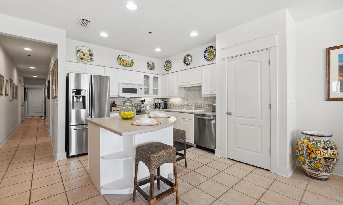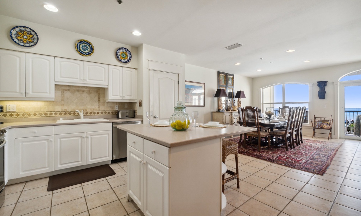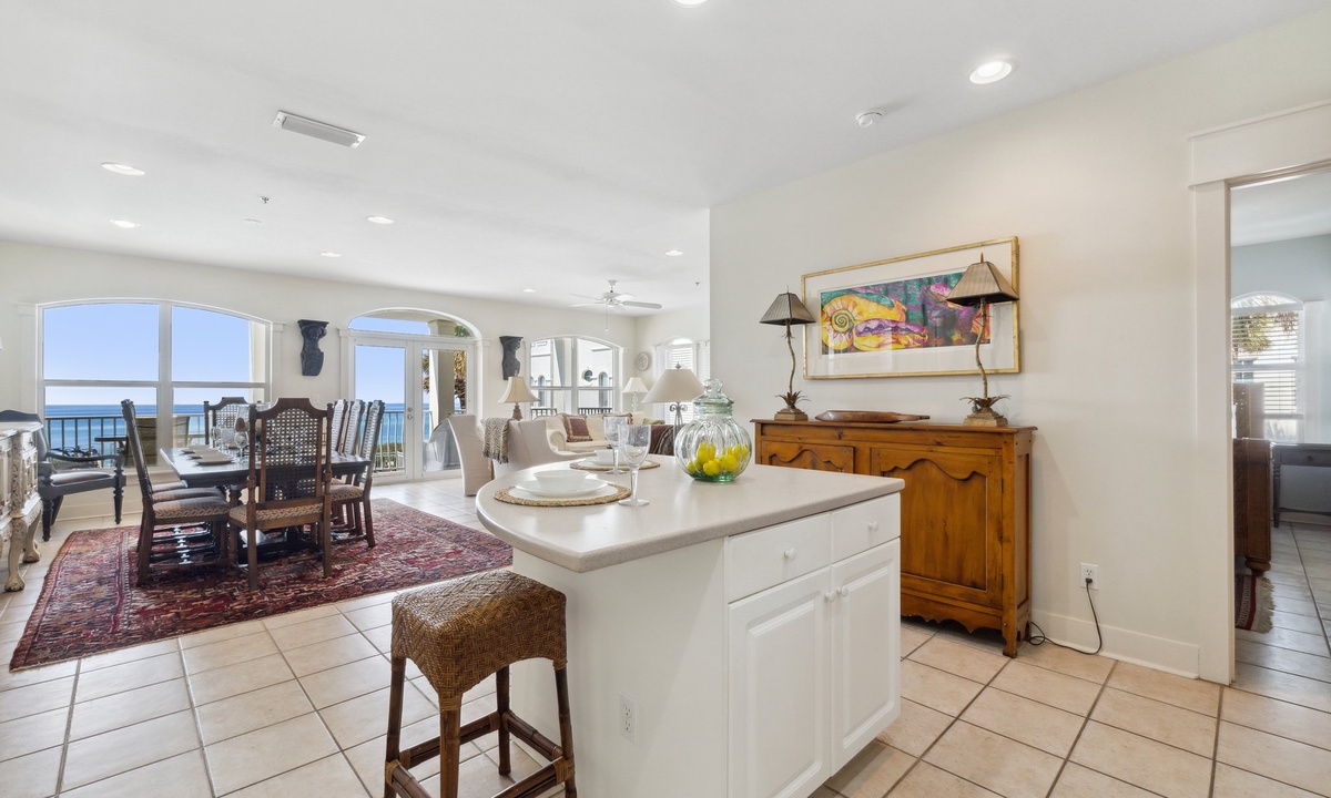 The fully stocked kitchen is perfect for whipping up meals with ease. Gather around the dining table with Gulf views as your backdrop for unforgettable family dinners.