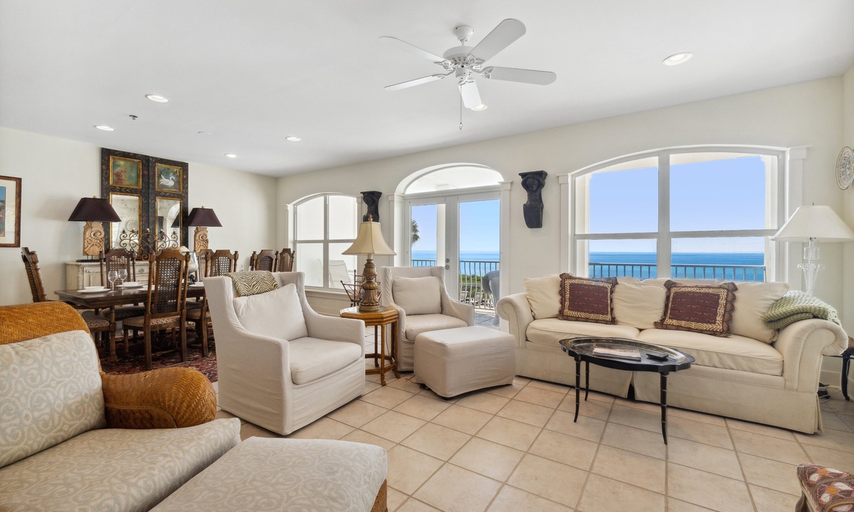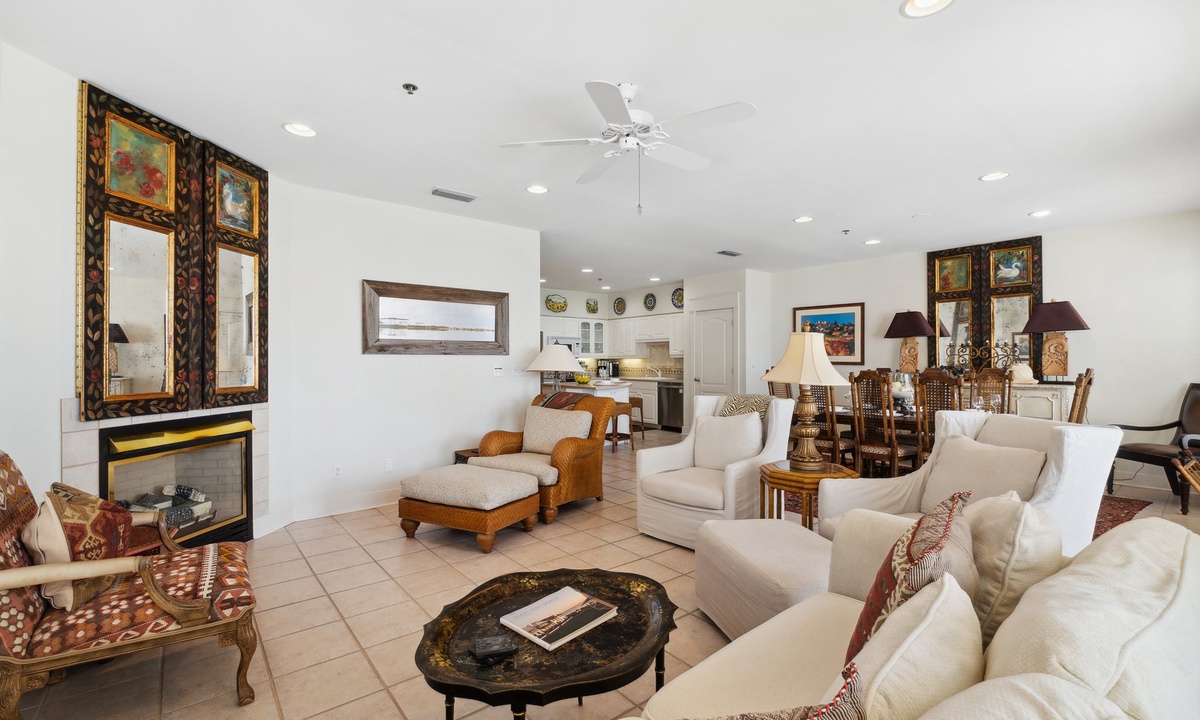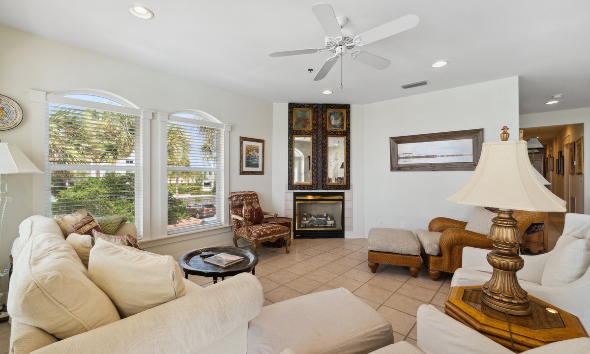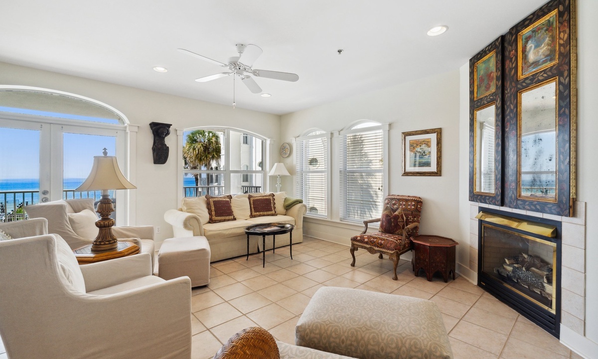 ⭐ “The property was exactly as described – clean, spacious, and just a short walk to the beach. Perfect for families!” – David P.Step into the open-concept living area with cozy seating, a gas fireplace, and large windows showcasing Gulf and pool views. Whether relaxing with a book or enjoying family movie night, this space is both inviting and functional.