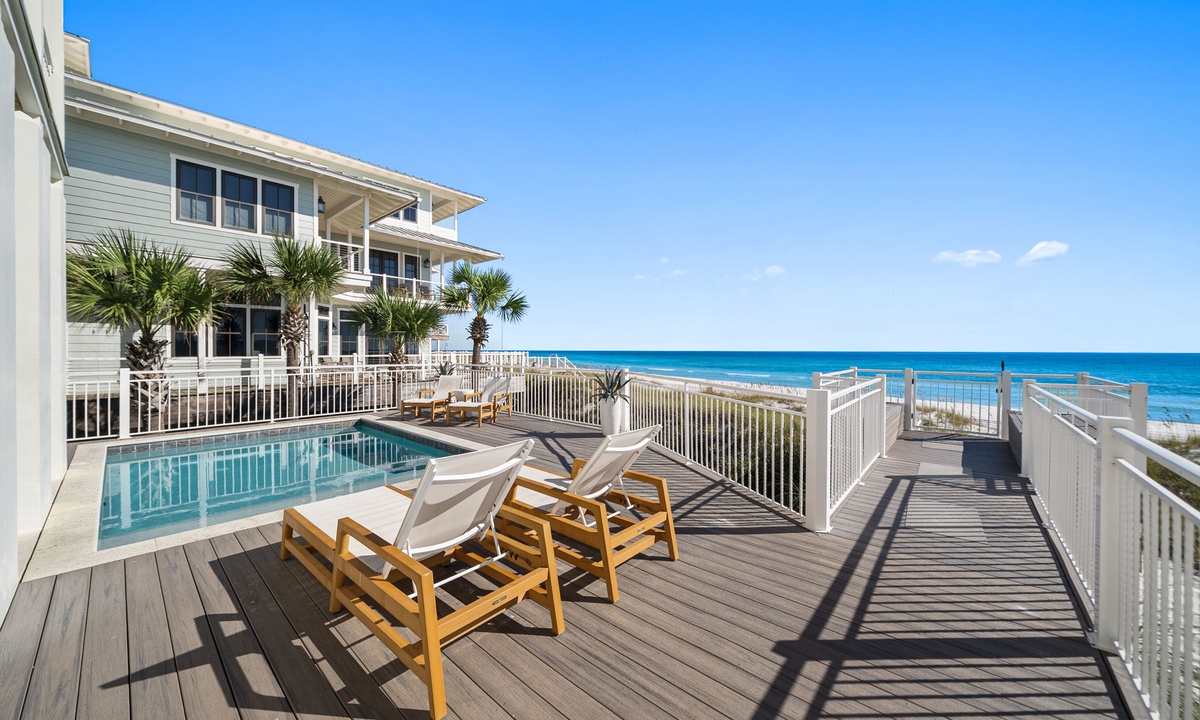 Q: Is there an outdoor dining table or outdoor sectional for gathering and enjoying the incredible pool area?- Chelsea Z. Posted: 09/08/2020A:Hi Chelsea, thank you for your interest in our Seagrove Beach Gulf-front vacation rental "The Odessa"! This pool deck is furnished with loungers and chairs for sunbathing and relaxing, while upstairs on the second-floor balcony you'll find exterior dining and gas grill for entertaining.
