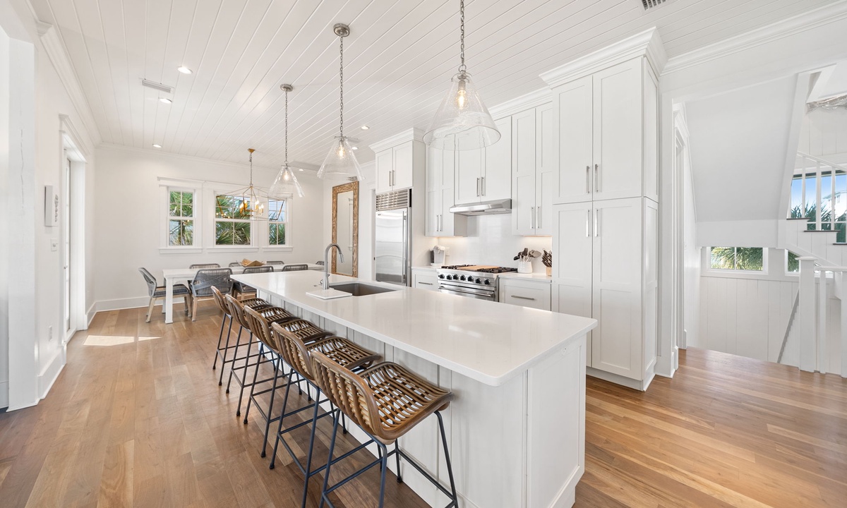 Bring your loved ones together in the stunning chef’s kitchen, designed for functionality and style. This culinary haven features high-end stainless steel appliances, a professional-grade six-burner gas range, and everything you need to create memorable meals. The elegant dining table comfortably seats 8 guests, with an additional 5 seats at the spacious kitchen island—perfect for casual conversations or quick bites. For even more entertaining options, the 1st-floor living area offers a cozy dining table for 4 alongside a sleek wet bar, creating the ultimate space for relaxed gatherings and unforgettable moments.