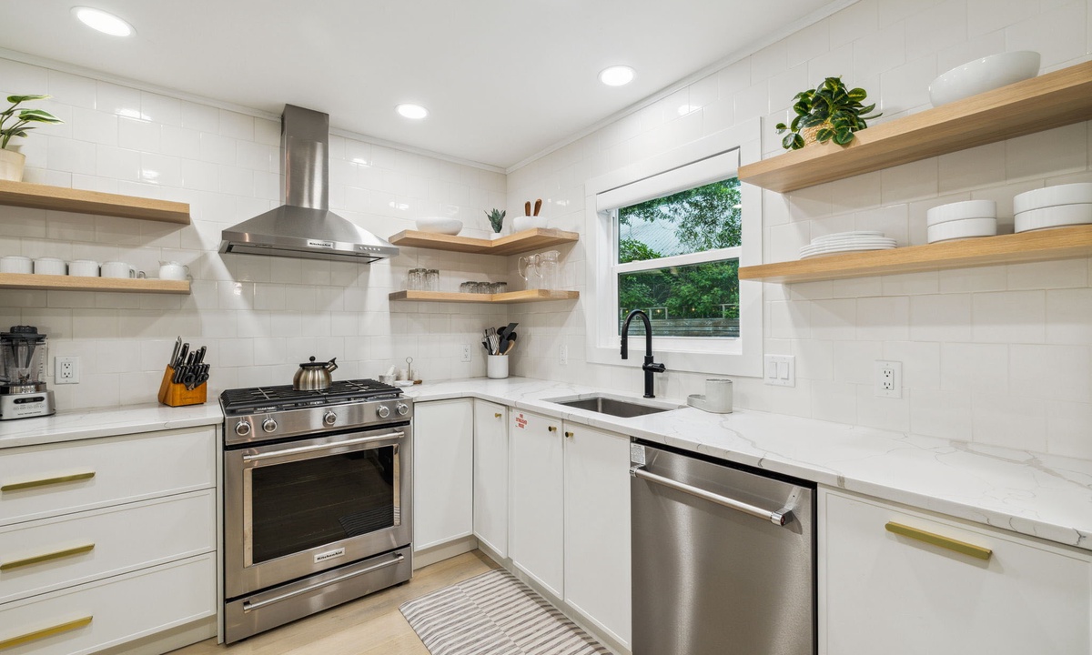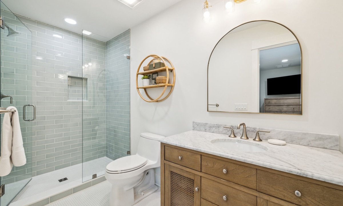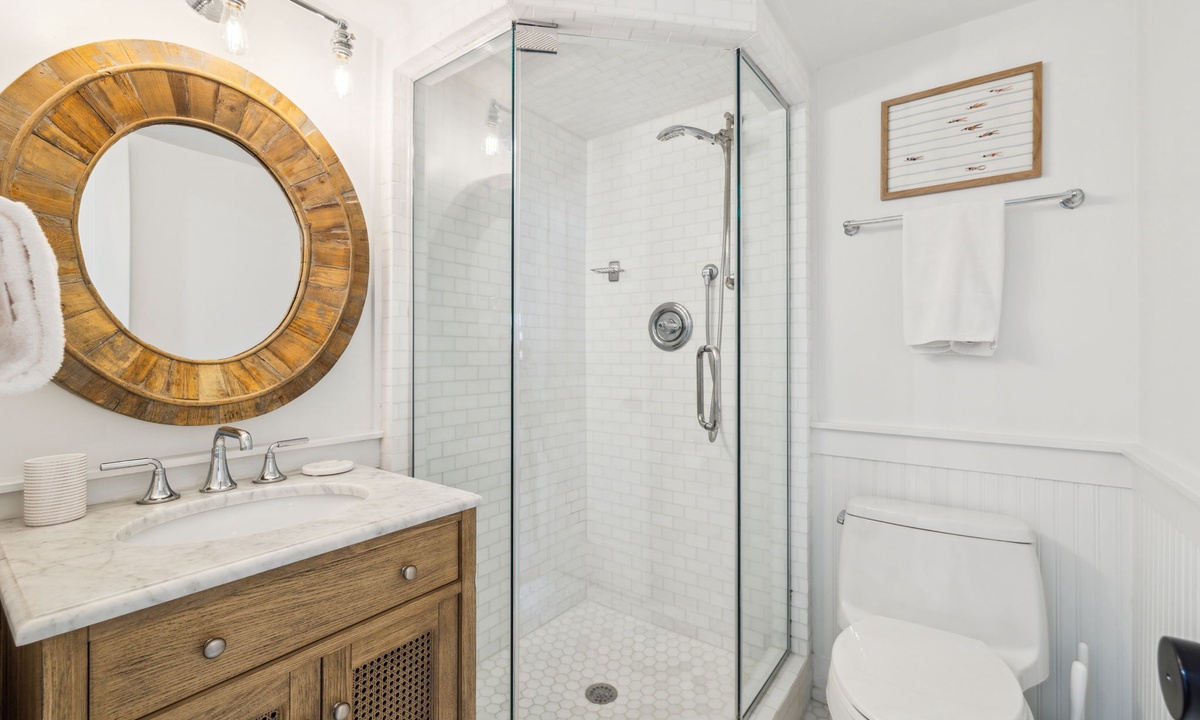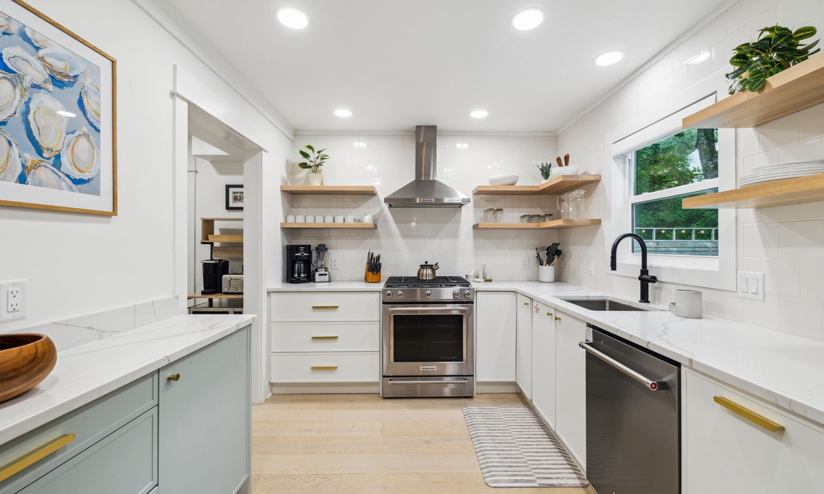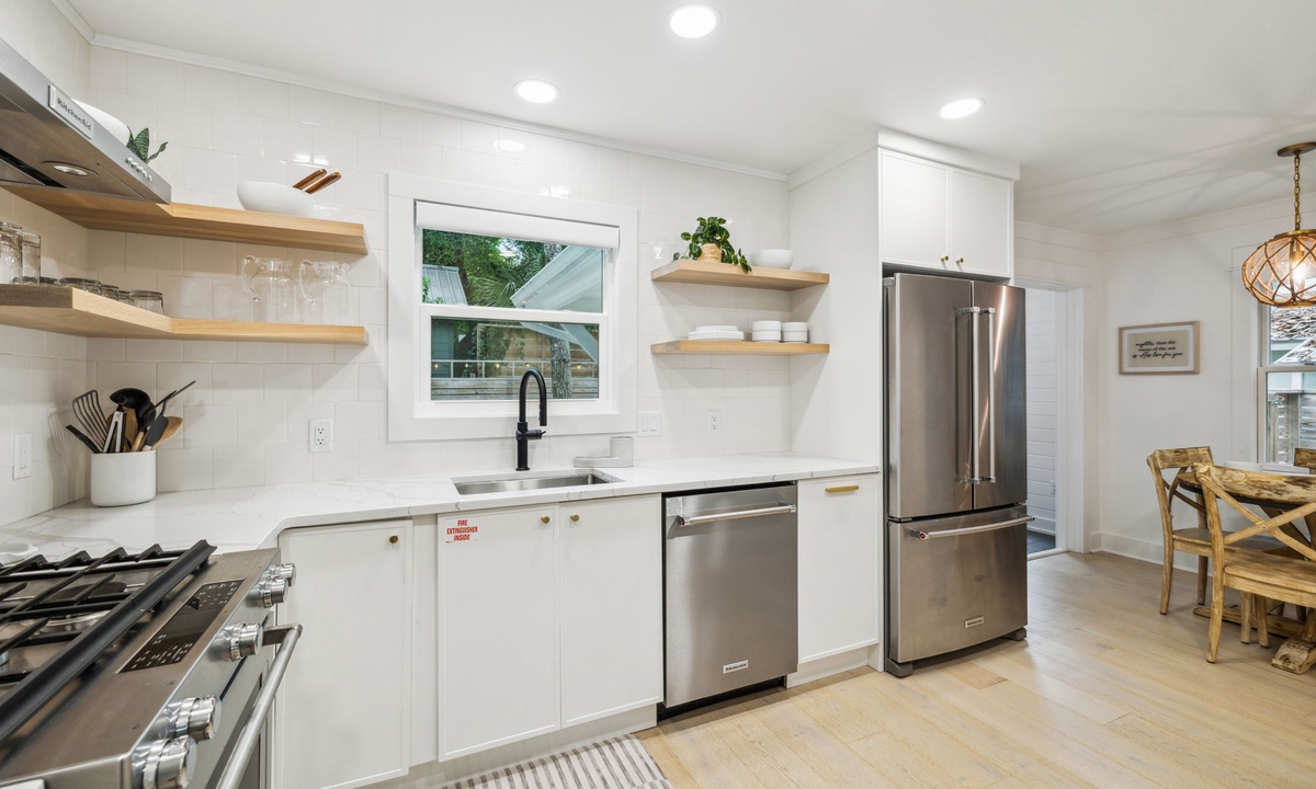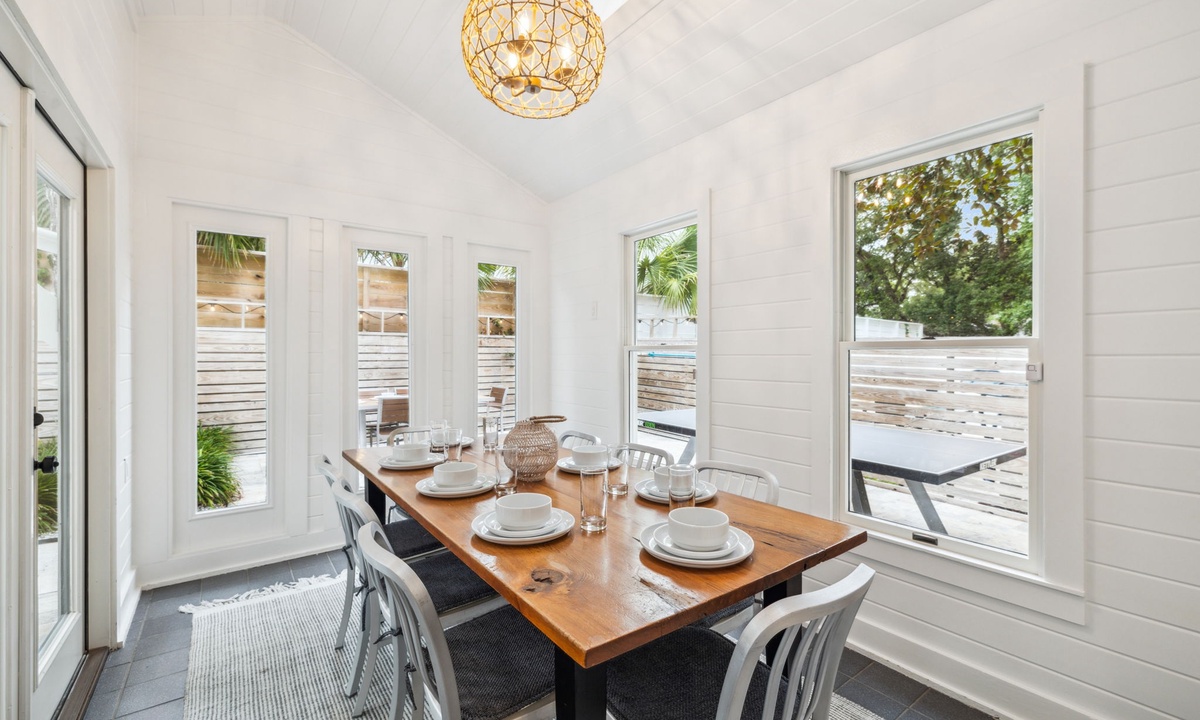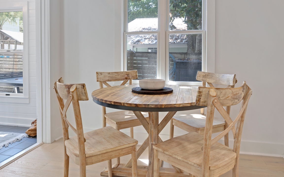 The kitchen offers everything you need to enjoy meals at home during your beach getaway. Outfitted with stainless steel appliances and quartz countertops, it’s both functional and inviting. Dine together indoors at the large table, enjoy casual bites at the breakfast nook, or take things outside for a meal on the patio.